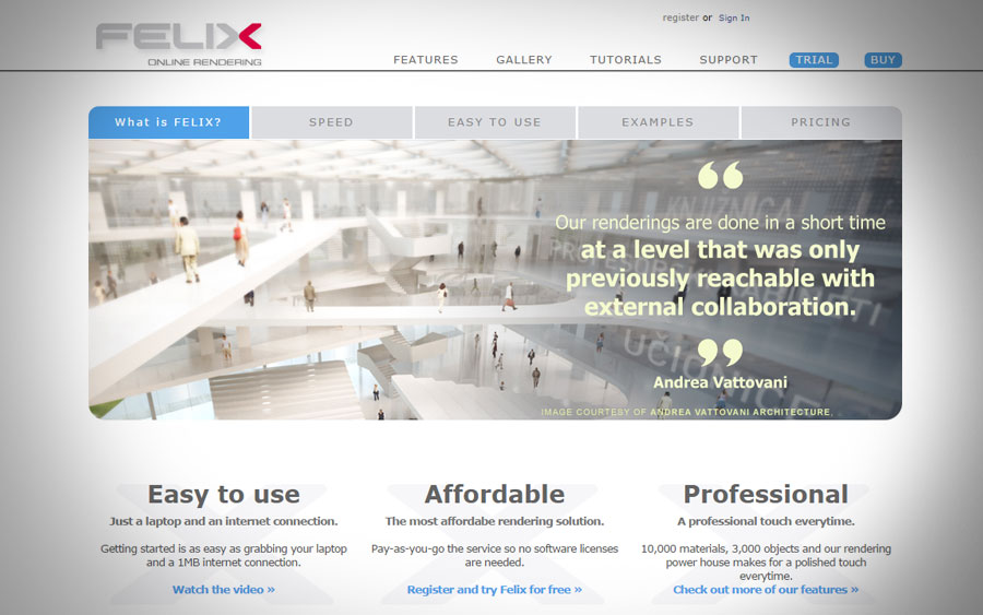 Andrea Vattovani is featured as the testimonial for Felix Render in the brand new homepage along with other Architects like Hani Rashid from Asymptote and Zaha Hadid Architects.
