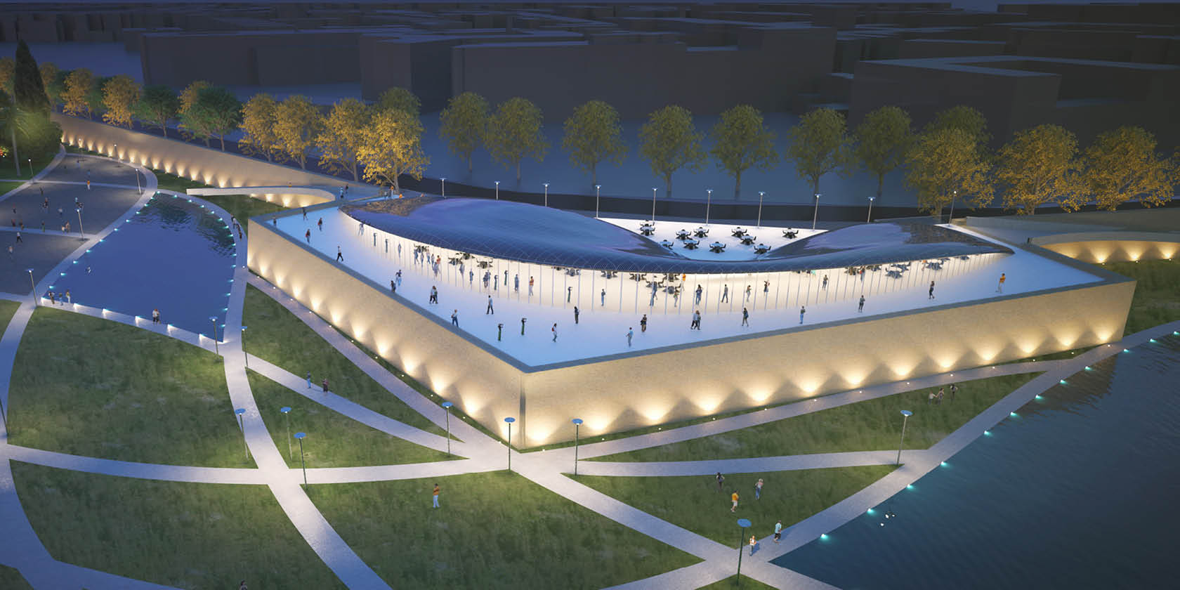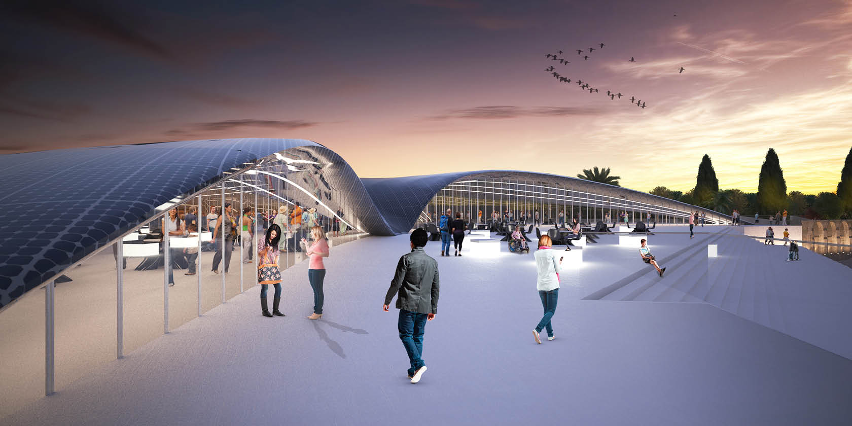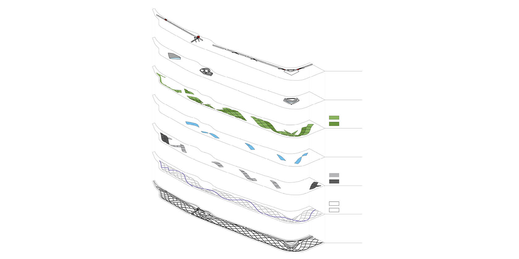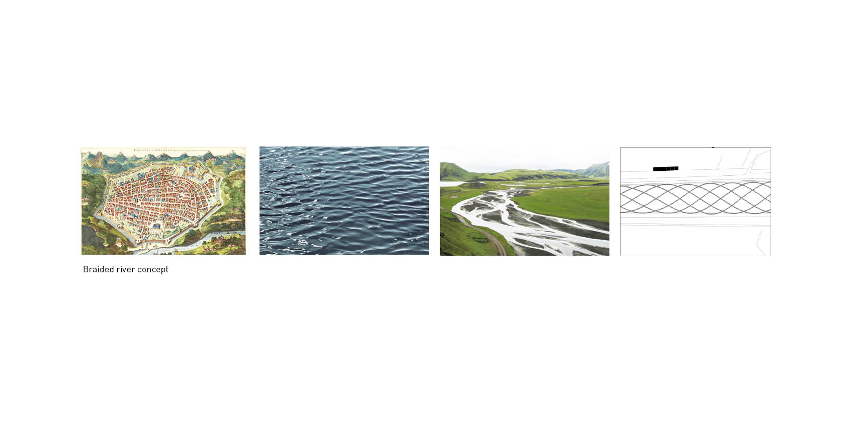 The water has a precise shape to which we were inspired by, the waves and the movement of them, because the movement is fundamental for us. We gave a shape to our park inspired by nature by the Braided Rivers, a special kind of river morphology, from which comes our “twisted form”. The the fountains are designed to collect water in order to provide for the irrigation of the park.
