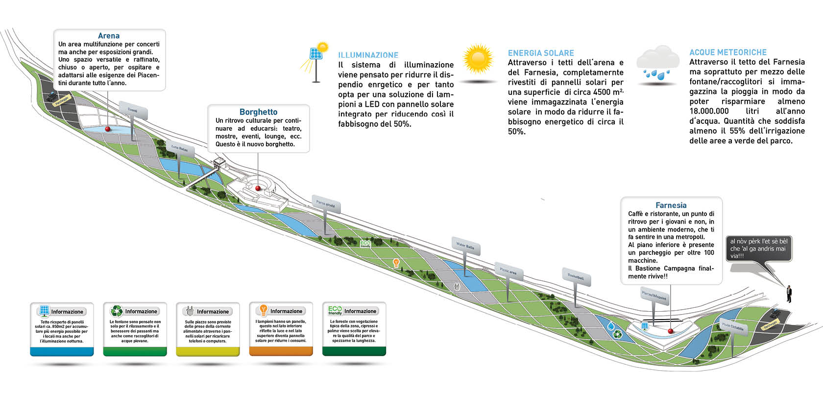 With this project we want first of all to give life back to the “Walls”. An intervention needed to preserve, redevelop and enhance the walls of the city, especially to improve the lives quality of Piacenza. Nowadays, it is no longer required its protective function and barrier, the walls should now fully integrate the park and the city.