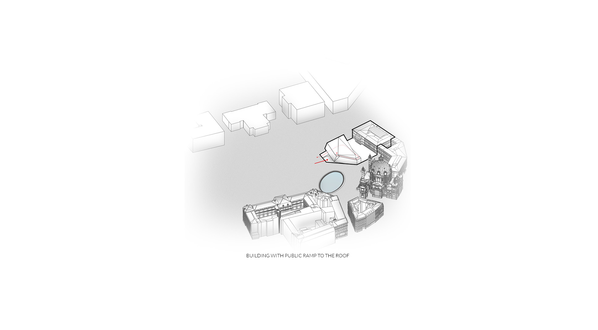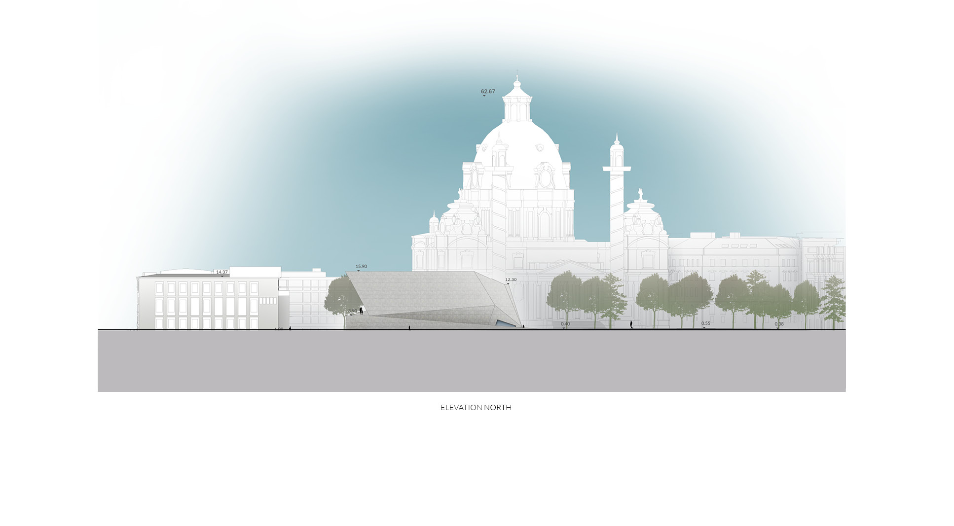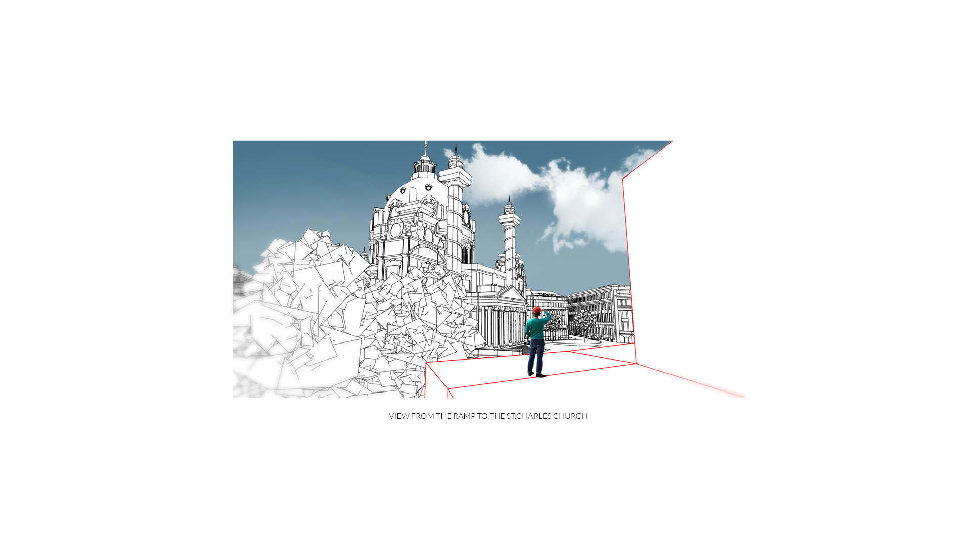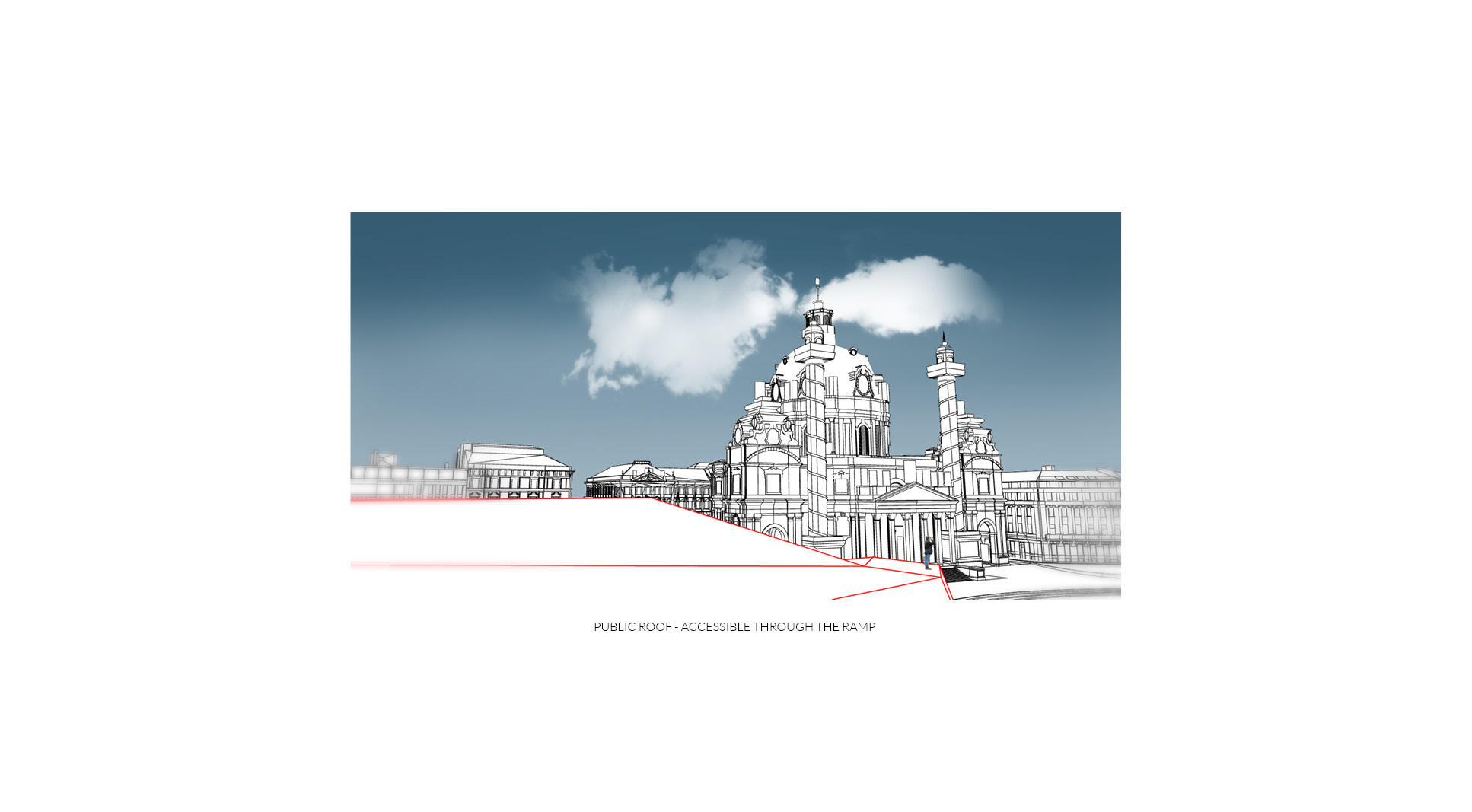 The museum is located on one of the most prominent squares in Vienna. Unfortunately it is also one of urbanistically most problematic places in Vienna. The location of the newly planned extension of the “Wien Museum” is a great opportunity to improve the spatial qualities of “Karlsplatz”. The wonderful St. Charles’ Church is for sure one of the highlights of the square and Vienna in general. Urbanistacally the church is the focal point of the square, which has a good effect on it but the surrounding structures don’t really accompany this idea well. A building like St. Charles’ Church requires symmetry surrounding it to present itself even better. This inconsistency in urban planning is always present on the square and it gets more and more clear when you start to spend some time on the square. The current landscaping of the square just adds up to the inconsistency and is therefore also a part of the problem. The “Wien Museum” extension is a possible solution to this problematic urban situation. It should emphasize the spatial qualities of “Karlsplatz” and invite visitors to the square. The St. Charles’ Church should still stay as the focal point of the square and the urban axis are defined through its position and symmetry. The new extension should “restore” the symmetry of the square. There were three important elements that effected the form of the new building: firstly the central church axis was taken as the mirroring axis for the alignment lines of the TU Wien building, secondly the continuation of the Canovagasse axis in order to keep the view of the St. Charles’ Church, and finally the border with the Ringstrasse. The new building would house all the necessary exhibition spaces while the old building would be mostly used for the functions closed for public. The ground floor serves as the main museum entrance and transition space between the two exhibition spaces – the temporary exhibition spaces in the upper floors and the museum collection exhibition in the underground level. The ground floor also serves as the connection between Karlsplatz and the new space between the old Wien Musuem building and the extension. Since the main topic of the Wien Museum is the city of Vienna and its rich history the building itself forms a promenade for the visitors of Karlsplatz which leads them all the way to the roof of the new building. This provides the visitors with a new experience of the St. Charles’ Church, Karlsplatz and whole Vienna. The sloped roof could also be used for different events that take place on Karlsplatz during the warmer months of the year.