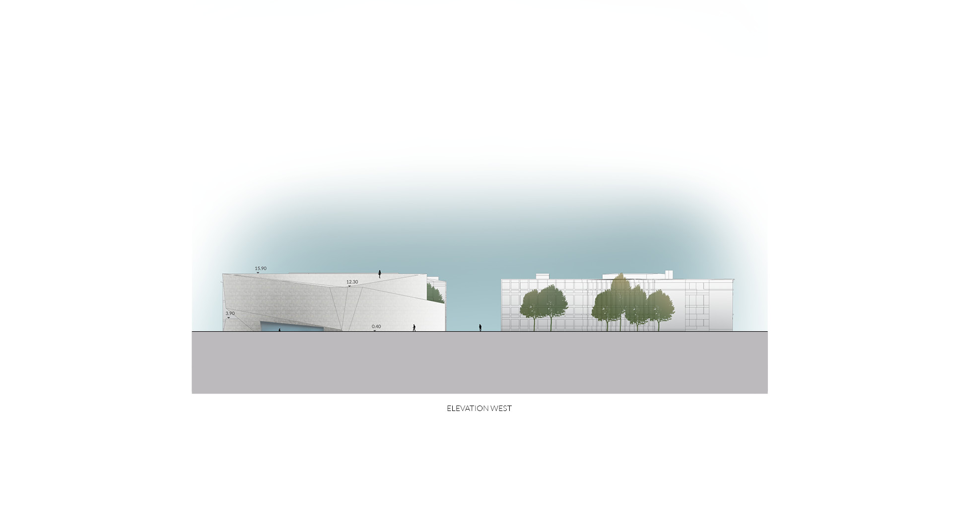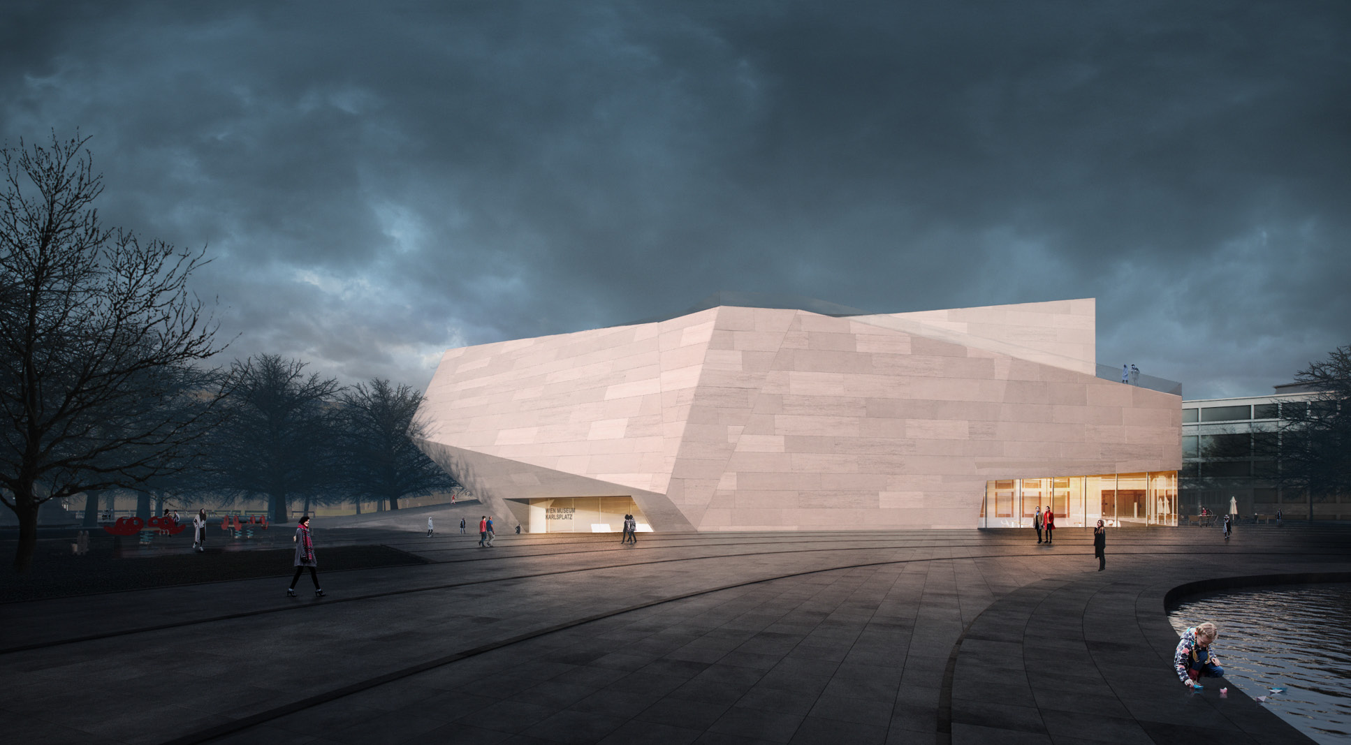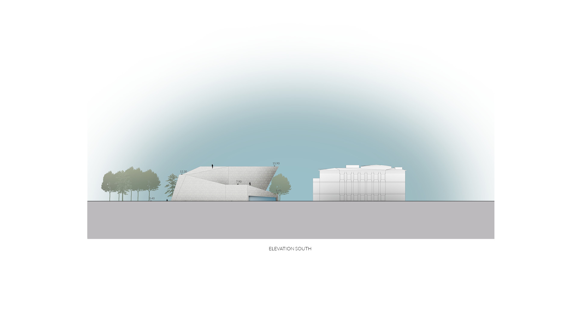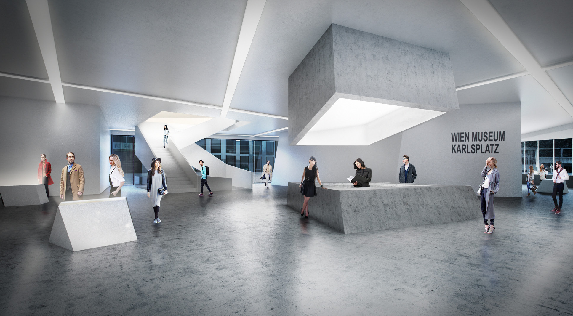 The museum is located on one of the most prominent squares in Vienna. Unfortunately it is also one of urbanistically most problematic places in Vienna. The location of the newly planned extension of the “Wien Museum” is a great opportunity to improve the spatial qualities of “Karlsplatz”. The wonderful St. Charles’ Church is for sure one of the highlights of the square and Vienna in general. Urbanistacally the church is the focal point of the square, which has a good effect on it but the surrounding structures don’t really accompany this idea well. A building like St. Charles’ Church requires symmetry surrounding it to present itself even better. This inconsistency in urban planning is always present on the square and it gets more and more clear when you start to spend some time on the square. The current landscaping of the square just adds up to the inconsistency and is therefore also a part of the problem. The “Wien Museum” extension is a possible solution to this problematic urban situation. It should emphasize the spatial qualities of “Karlsplatz” and invite visitors to the square. The St. Charles’ Church should still stay as the focal point of the square and the urban axis are defined through its position and symmetry. The new extension should “restore” the symmetry of the square. There were three important elements that effected the form of the new building: firstly the central church axis was taken as the mirroring axis for the alignment lines of the TU Wien building, secondly the continuation of the Canovagasse axis in order to keep the view of the St. Charles’ Church, and finally the border with the Ringstrasse. The new building would house all the necessary exhibition spaces while the old building would be mostly used for the functions closed for public. The ground floor serves as the main museum entrance and transition space between the two exhibition spaces – the temporary exhibition spaces in the upper floors and the museum collection exhibition in the underground level. The ground floor also serves as the connection between Karlsplatz and the new space between the old Wien Musuem building and the extension. Since the main topic of the Wien Museum is the city of Vienna and its rich history the building itself forms a promenade for the visitors of Karlsplatz which leads them all the way to the roof of the new building. This provides the visitors with a new experience of the St. Charles’ Church, Karlsplatz and whole Vienna. The sloped roof could also be used for different events that take place on Karlsplatz during the warmer months of the year.