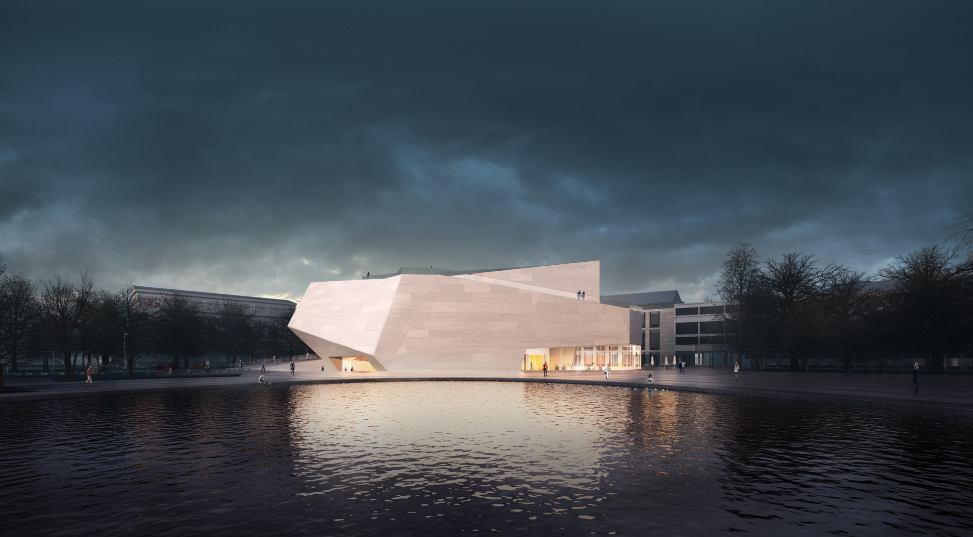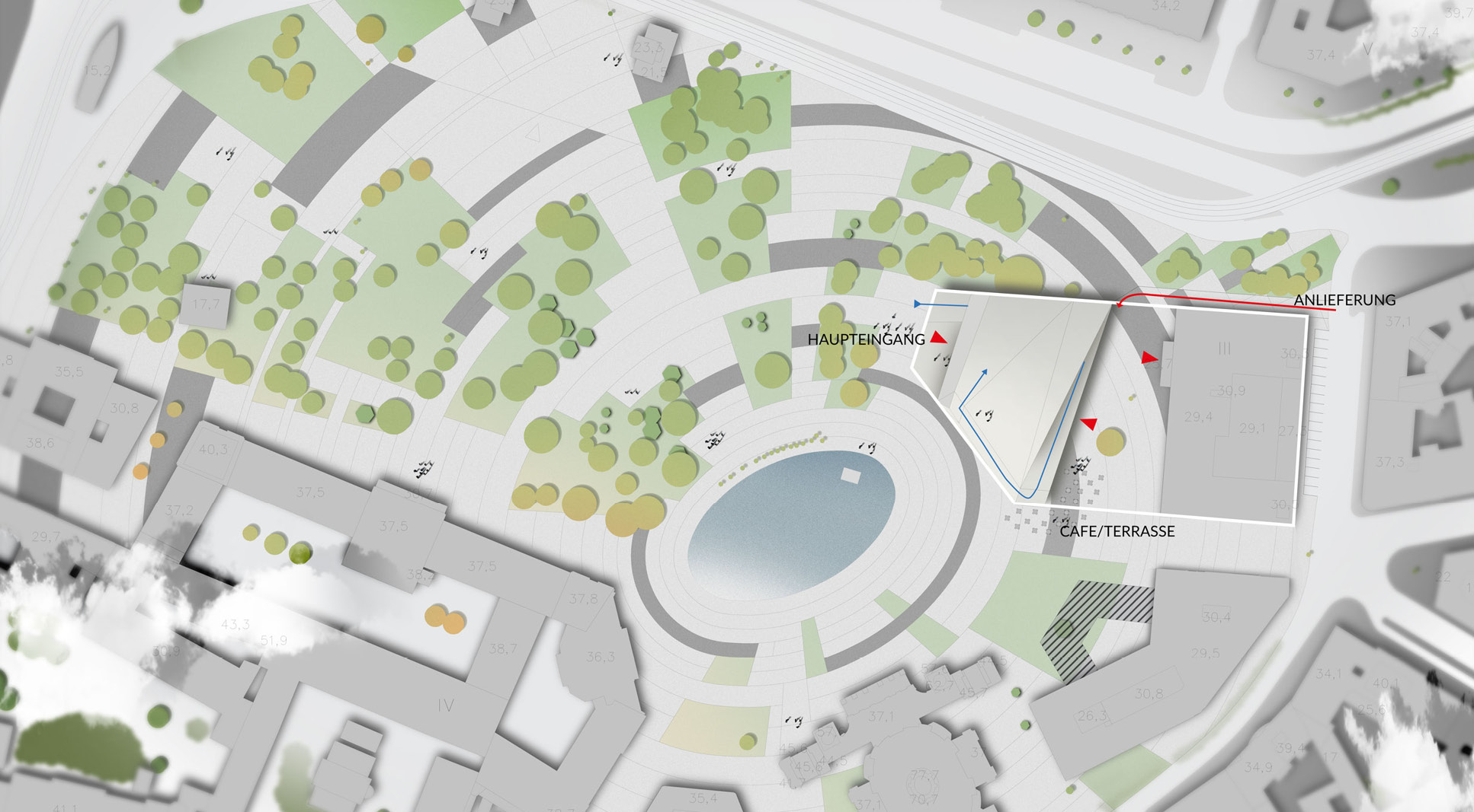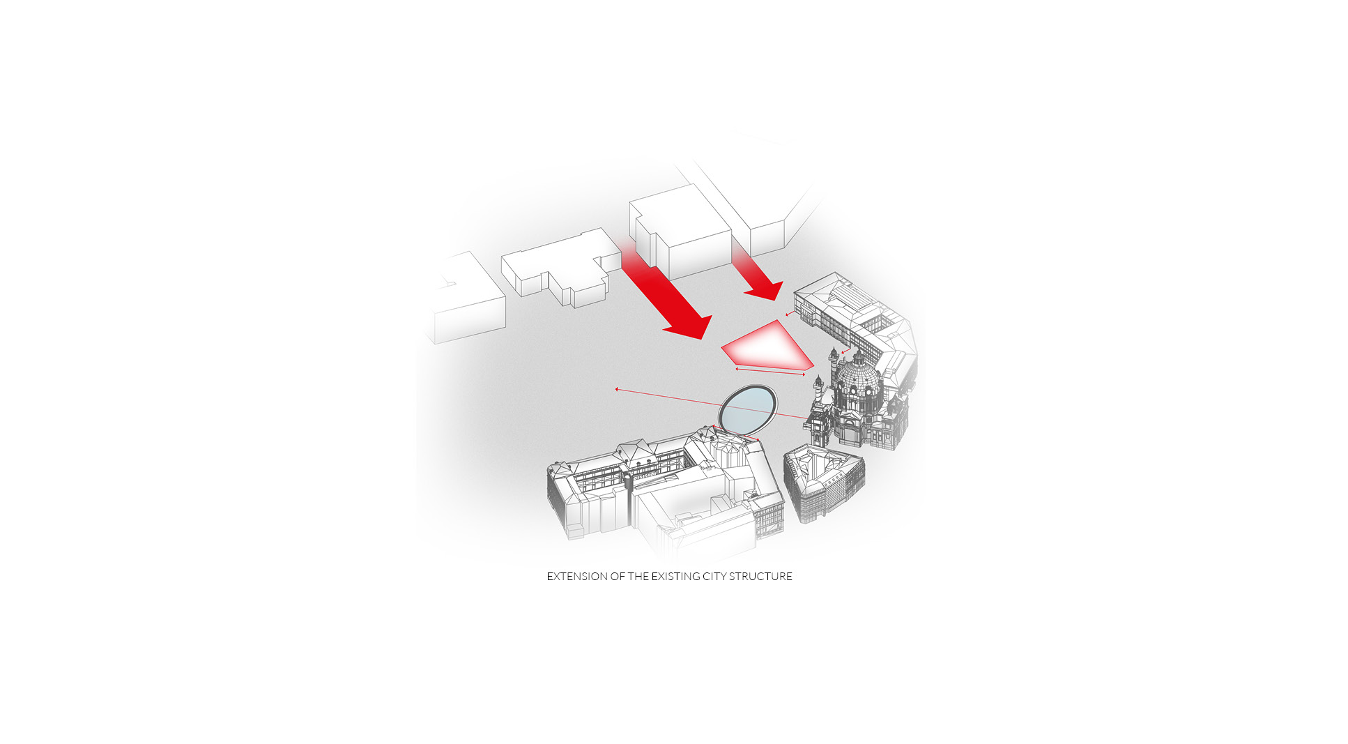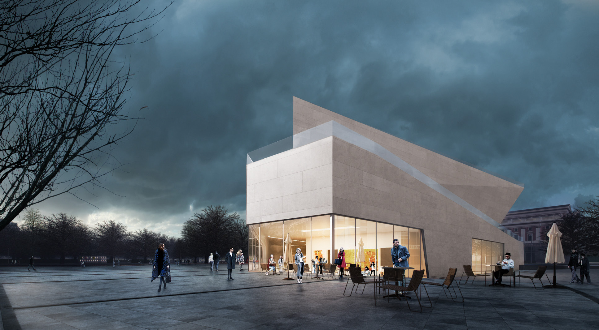The museum is located on one of the most prominent squares in Vienna. Unfortunately it is also one of urbanistically most problematic places in Vienna. The location of the newly planned extension of the “Wien Museum” is a great opportunity to improve the spatial qualities of “Karlsplatz”. The wonderful St. Charles’ Church is for sure one of the highlights of the square and Vienna in general. Urbanistacally the church is the focal point of the square, which has a good effect on it but the surrounding structures don’t really accompany this idea well. A building like St. Charles’ Church requires symmetry surrounding it to present itself even better. This inconsistency in urban planning is always present on the square and it gets more and more clear when you start to spend some time on the square. The current landscaping of the square just adds up to the inconsistency and is therefore also a part of the problem. The “Wien Museum” extension is a possible solution to this problematic urban situation. It should emphasize the spatial qualities of “Karlsplatz” and invite visitors to the square. The St. Charles’ Church should still stay as the focal point of the square and the urban axis are defined through its position and symmetry. The new extension should “restore” the symmetry of the square. There were three important elements that effected the form of the new building: firstly the central church axis was taken as the mirroring axis for the alignment lines of the TU Wien building, secondly the continuation of the Canovagasse axis in order to keep the view of the St. Charles’ Church, and finally the border with the Ringstrasse. The new building would house all the necessary exhibition spaces while the old building would be mostly used for the functions closed for public. The ground floor serves as the main museum entrance and transition space between the two exhibition spaces – the temporary exhibition spaces in the upper floors and the museum collection exhibition in the underground level. The ground floor also serves as the connection between Karlsplatz and the new space between the old Wien Musuem building and the extension. Since the main topic of the Wien Museum is the city of Vienna and its rich history the building itself forms a promenade for the visitors of Karlsplatz which leads them all the way to the roof of the new building. This provides the visitors with a new experience of the St. Charles’ Church, Karlsplatz and whole Vienna. The sloped roof could also be used for different events that take place on Karlsplatz during the warmer months of the year.