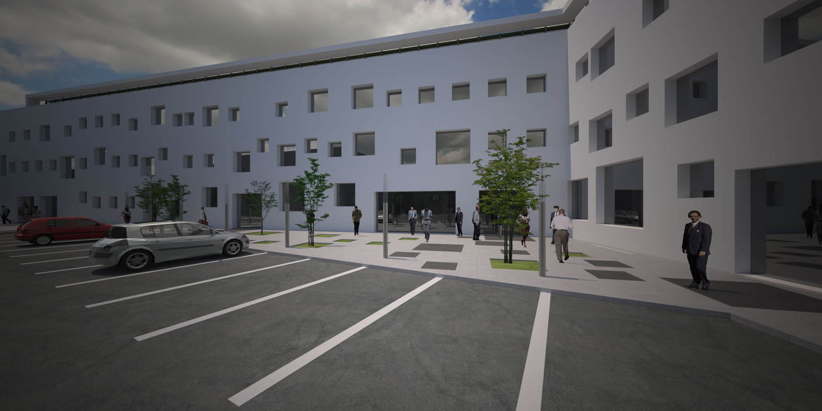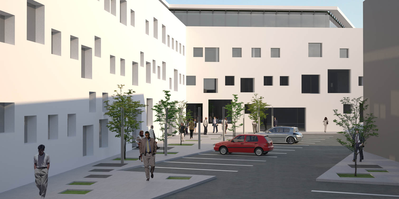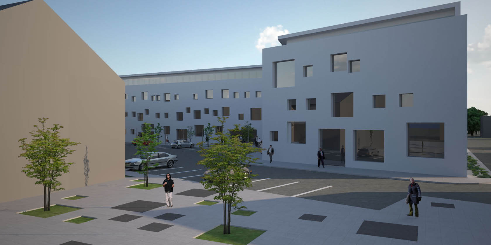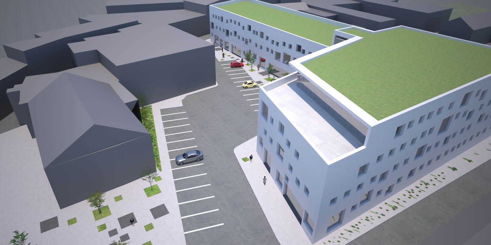To store the desired living and commercial areas, the choice was an L formed structure which gets one of its ending until the new square. Further the inclination of the front of the building should avoid a closed courtyard feeling and make possibel a flowing traffic circulation.