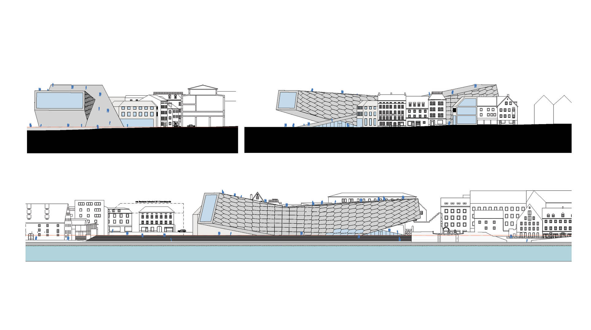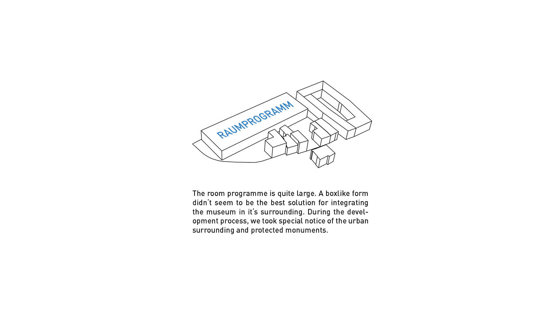 The room programme is quite large. A boxlike form didn‘t seem to be the best solution for integrating the museum in it‘s surrounding. During the development process, we took special notice of the urban surrounding and protected monuments.