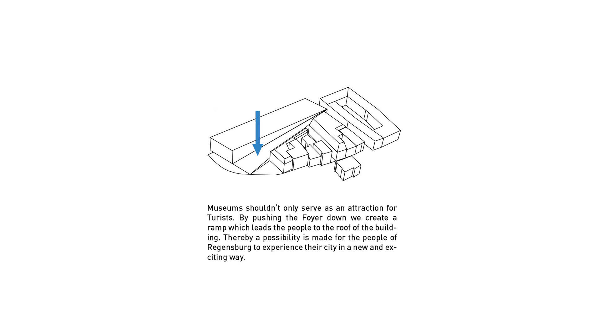 Museums shouldn‘t only serve as an attraction for Turists. By pushing the Foyer down we create a ramp which leads the people to the roof of the building. Thereby a possibility is made for the people of Regensburg to experience their city in a new and exciting way.