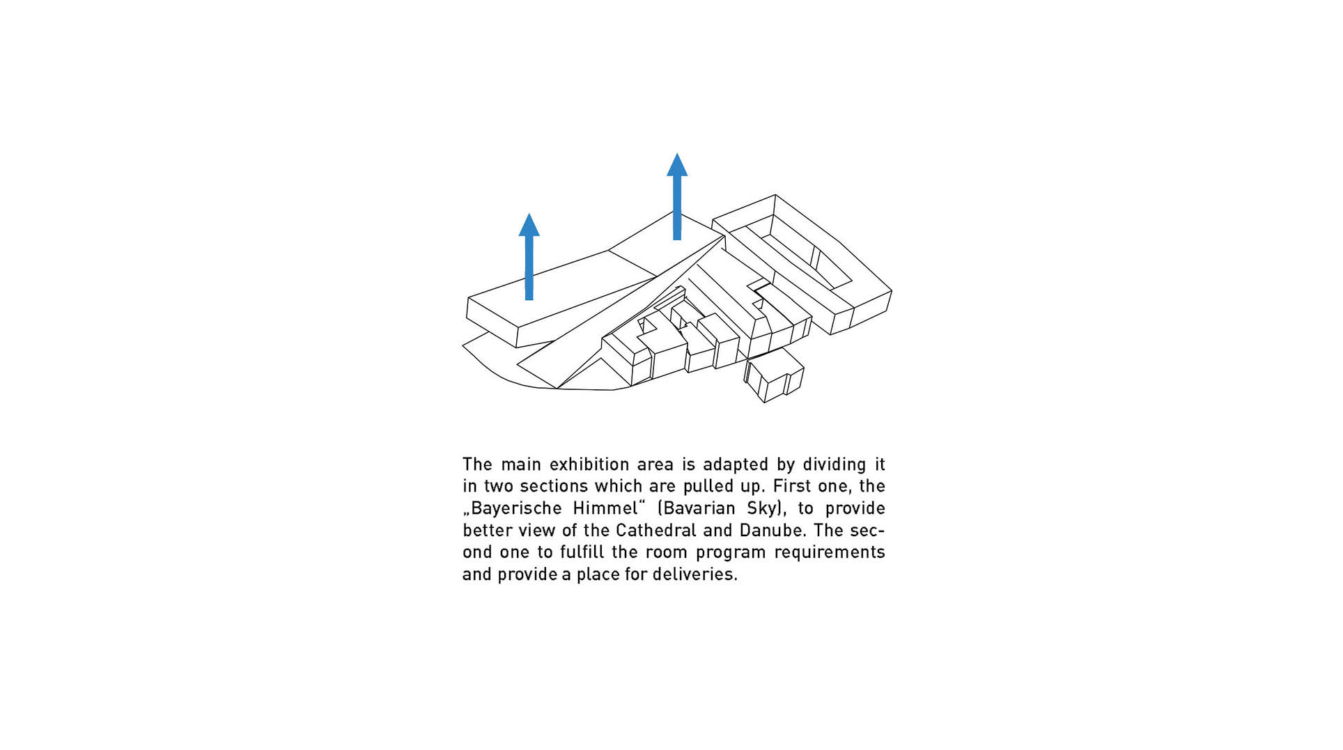The main exhibition area is adapted by dividing it in two sections which are pulled up. First one, the „Bayerische Himmel“ (Bavarian Sky), to provide