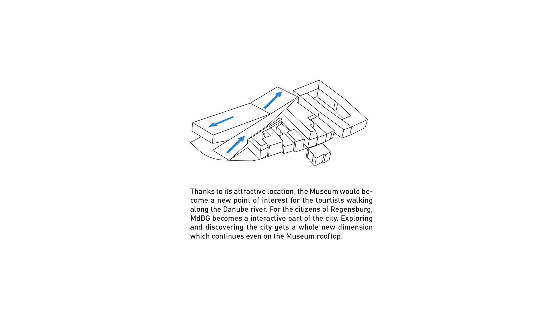 Thanks to its attractive location, the Museum would become a new point of interest for the tourtists walking along the Danube river. For the citizens of Regensburg, MdBG becomes a interactive part of the city. Exploring and discovering the city gets a whole new dimension which continues even on the Museum rooftop.