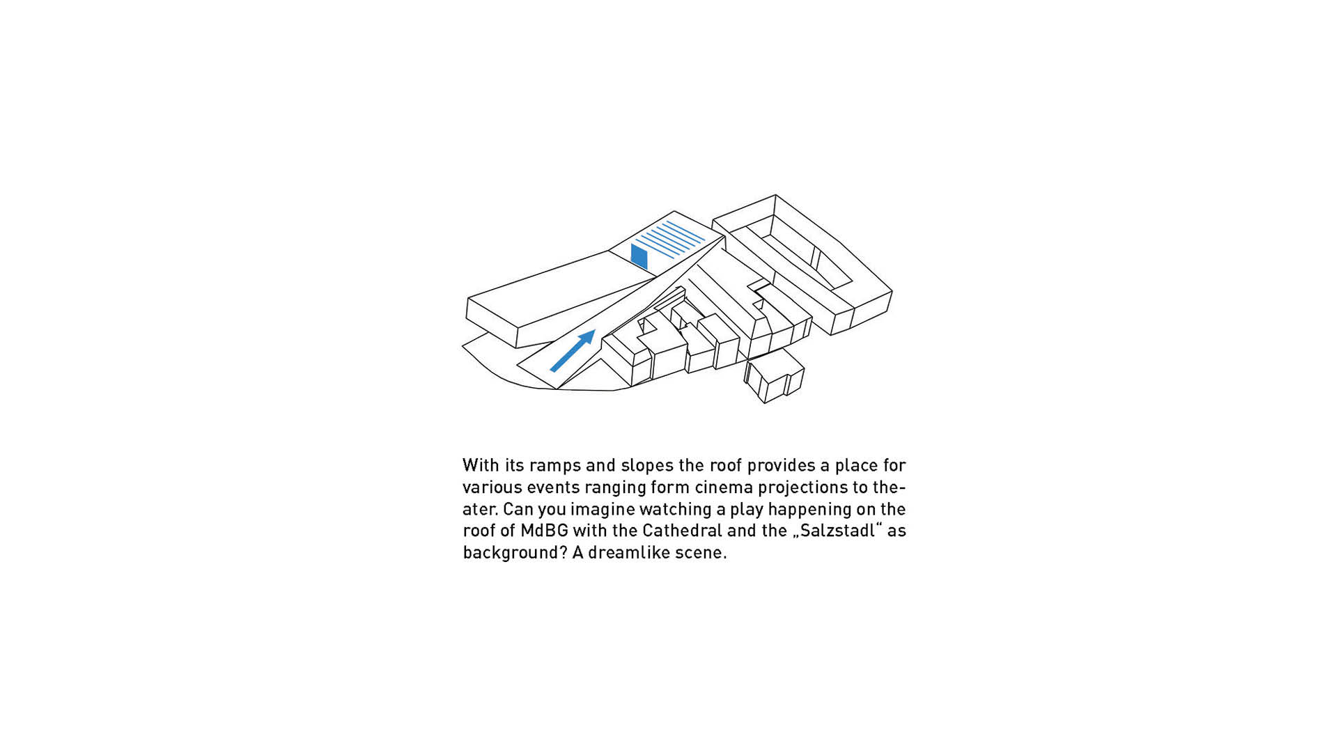 With its ramps and slopes the roof provides a place for various events ranging form cinema projections to theater. Can you imagine watching a play happening on the roof of MdBG with the Cathedral and the „Salzstadl“ as background? A dreamlike scene.