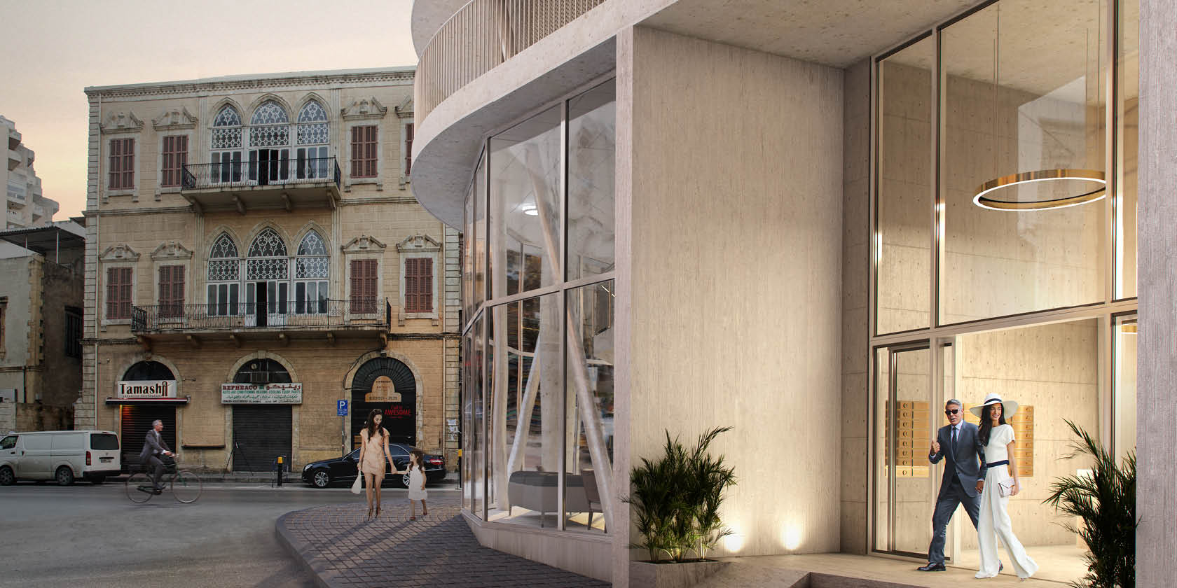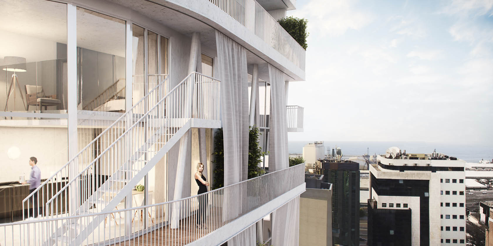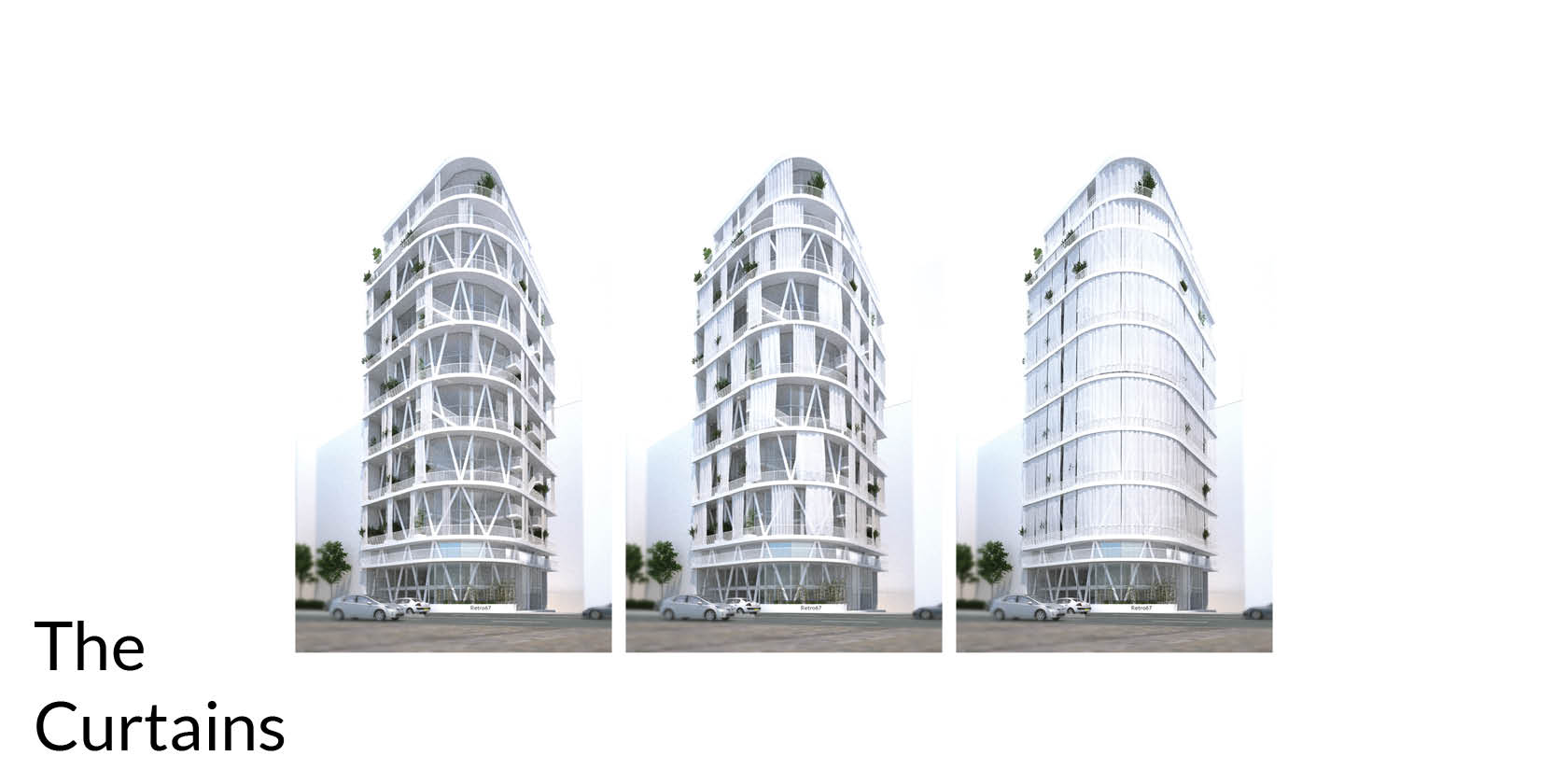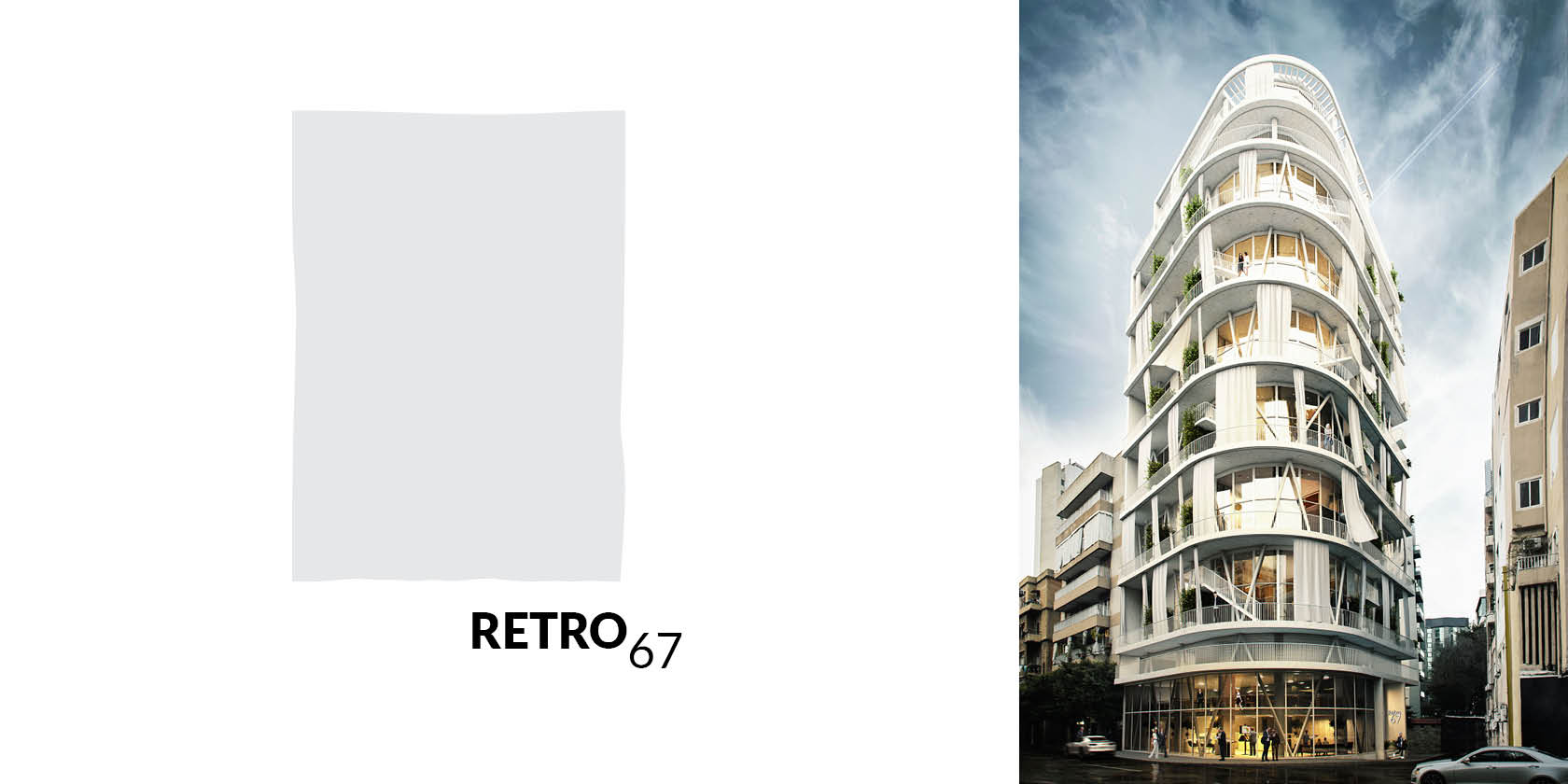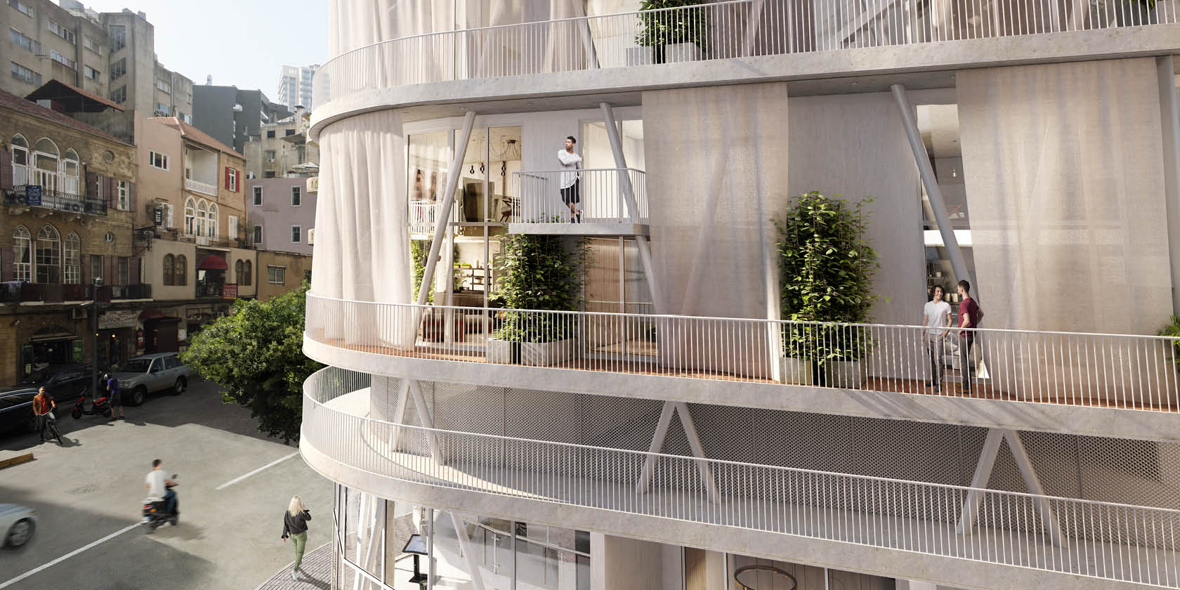 Building for the future but with an awareness of the past has always been of great importance for us at Andrea Vattovani Architecture. Our strategy the “programmed glocalization” is our response for this fast-developing world where we sadly see more and more projects that seem like they could be transferred from one city to another. We believe this is wrong. Every project we do starts with a thorough research of the place we are working at, because every place has a unique story to tell either because of the context or rich cultural background. “Retro67” perhaps wants to communicate even more its strong relation to Beirut. We picked up several elements from the surrounding, starting with the protection from the sun. Beirut is very sunny and people tend to protect their flats and balcony from direct light and heat. All around Beirut you can see old flats with the oldest man made (and probably easiest) form of sunshade – “Retro67”. We decided to reinterpret this element and add it to our design. In Beirut you can also find balconies that are quite green, a lot of plants and/or nature that has taken over the manmade structures. So we also decided to add this green element, plants as source of fresh oxygen and again maybe the very first sunshade. Imagine the picture of a person sitting under a tree. Urbanism for us it is very important, in site plan you can see that we respect the structure of the city and improve it. One very important element is also the corner. In Beirut there are several round buildings that seem so characteristic for it. Our round corner is a reminder of this element but also a solution to solve the unfriendly form of the plot. The rounded corner emphasizes the shape of the building but it doesn’t act as a balcony. The flats are very modern and tend to use wall materials like concrete and brick to create a vintage/industrial style. The top floors become bigger penthouses developing the whole area on one floor. All the apartments have access to terraces, which act as a buffer space between indoors and outdoors. The curtains and plants as well as additional smaller mezzanine terraces spread around building provide additional shade for the building a help creating a more comfortable climate and living conditions.