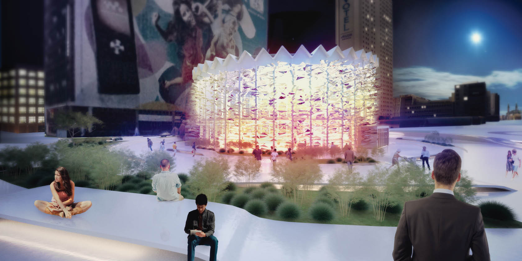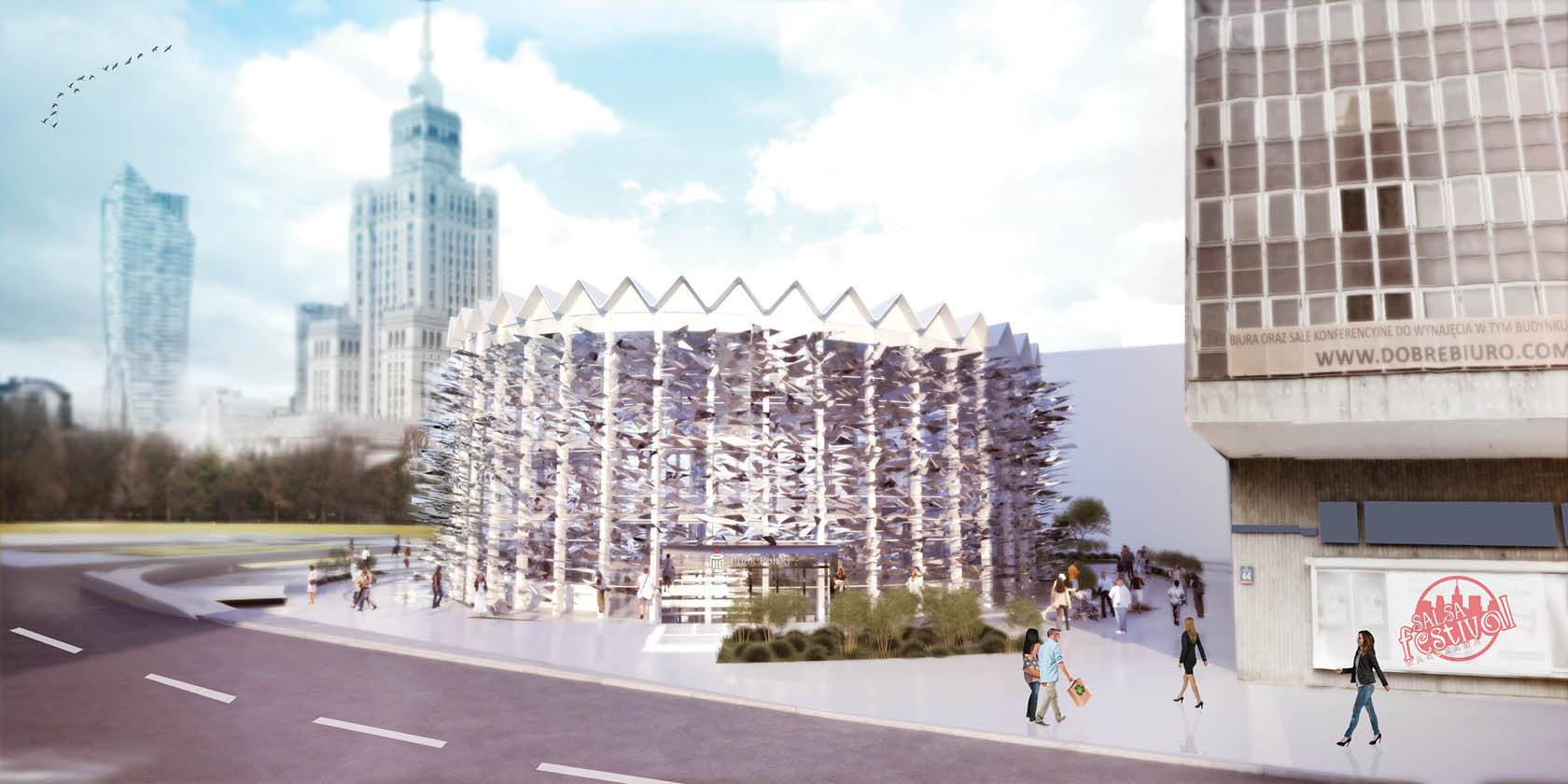 Doing that we achieve three really important things: we recreate an icon, preserve the history of the building and finally make sure nobody will use it again as gigantic advertising panel. We created a layer that symbolically represents the explosion of the glass captured in time, but instead of creating an ornament our façade has various functions. The splinter looking lamellas are sunshades made with DuPont SentryGlass and solar spheres. They would be used to reduce the energy consumption and in the night this elements integrate a dynamic lighting effects.
