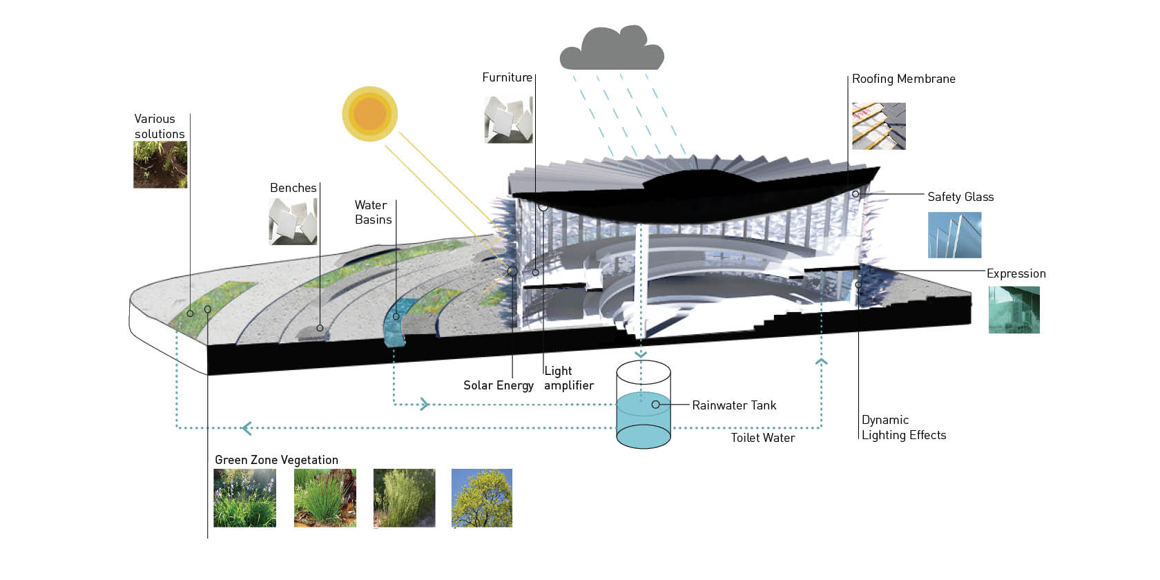 The design of the square resembles the shock waves of the explosion. The big surface of the roof and the area of the square will be used to collect rainwater which is then used for the toilets and irrigation of the green areas. DuPont™ Plantex® solutions are used to maintain the high quality of the green areas.
