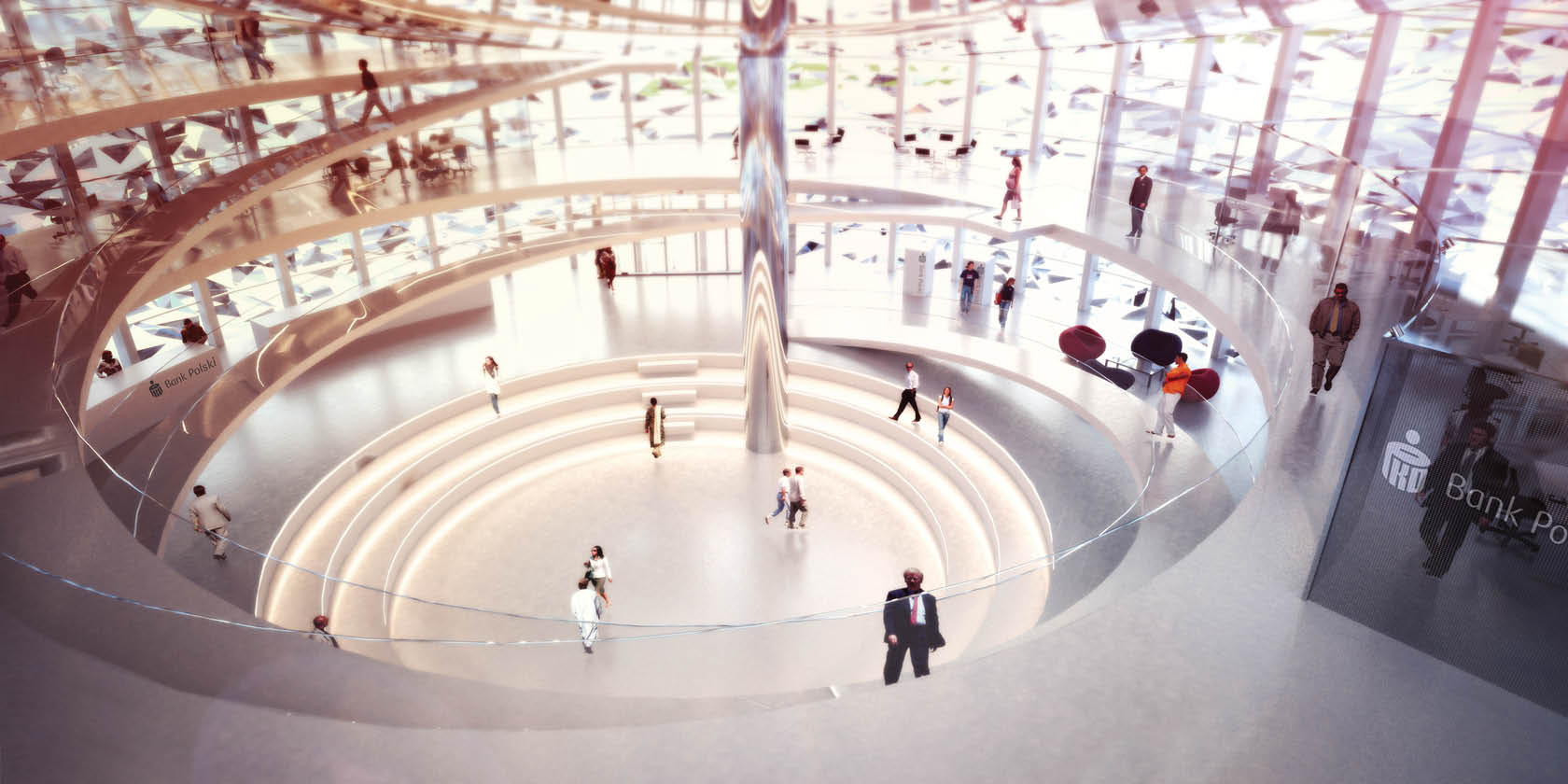 The interior, reinterpreted in a modern way, is developed in three levels -the ground level for the public and the upper levels as bank. For the interior we use a small but carefully chosen range of materials consisting of SentryGlass®, Corian®, metal and light concrete. The public level is designed as an extension of the public space, we bring the meeting point inside. It functions as an urban theater where anyone can perform but could also be used as exhibition area or space for private events of the bank. The public space outside the building serves as a place to rest surrounded by nature in middle of Warsaw. The benches made out of Corian create a nice spot to sit down while waiting for someone.