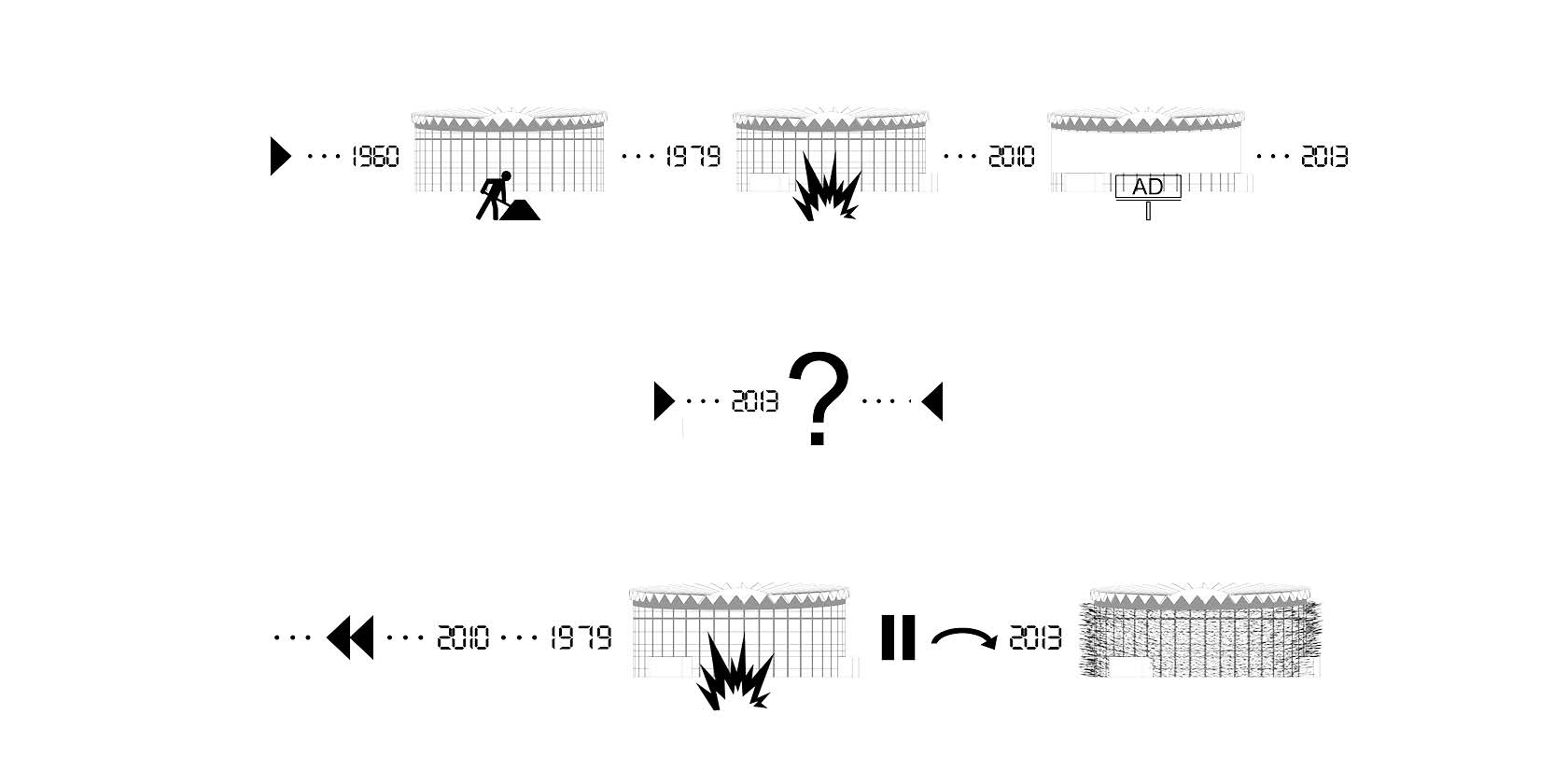The building is a Monument from the people to the people, in every research about the rotunda in every historical record two things keep showing up: the explosion of `79 and the following poorly executed reconstruction. Both of these elements were essential for our design and the right thing to do was to go back to the `79. We went back to the saddest moment and we framed that moment.