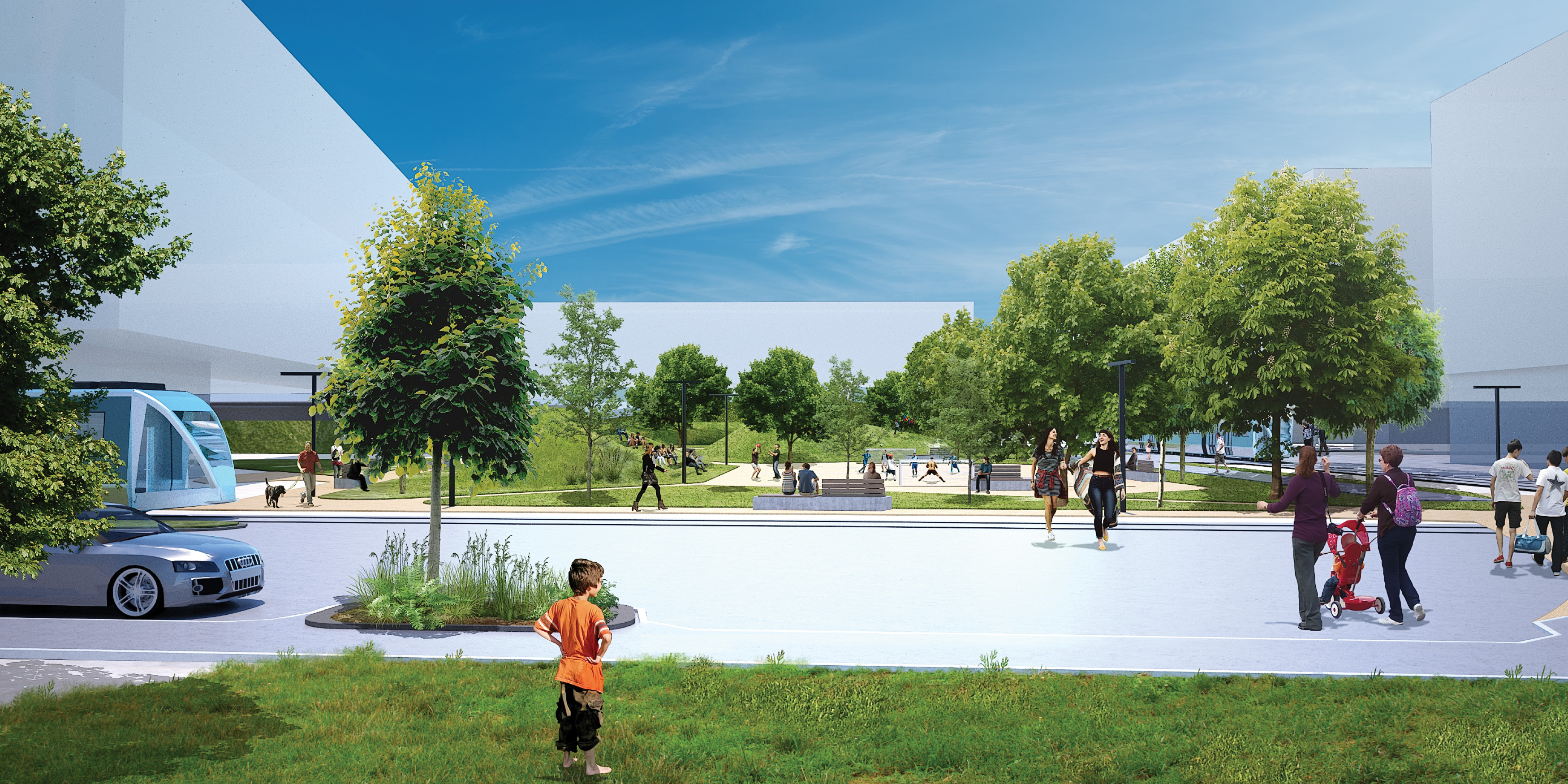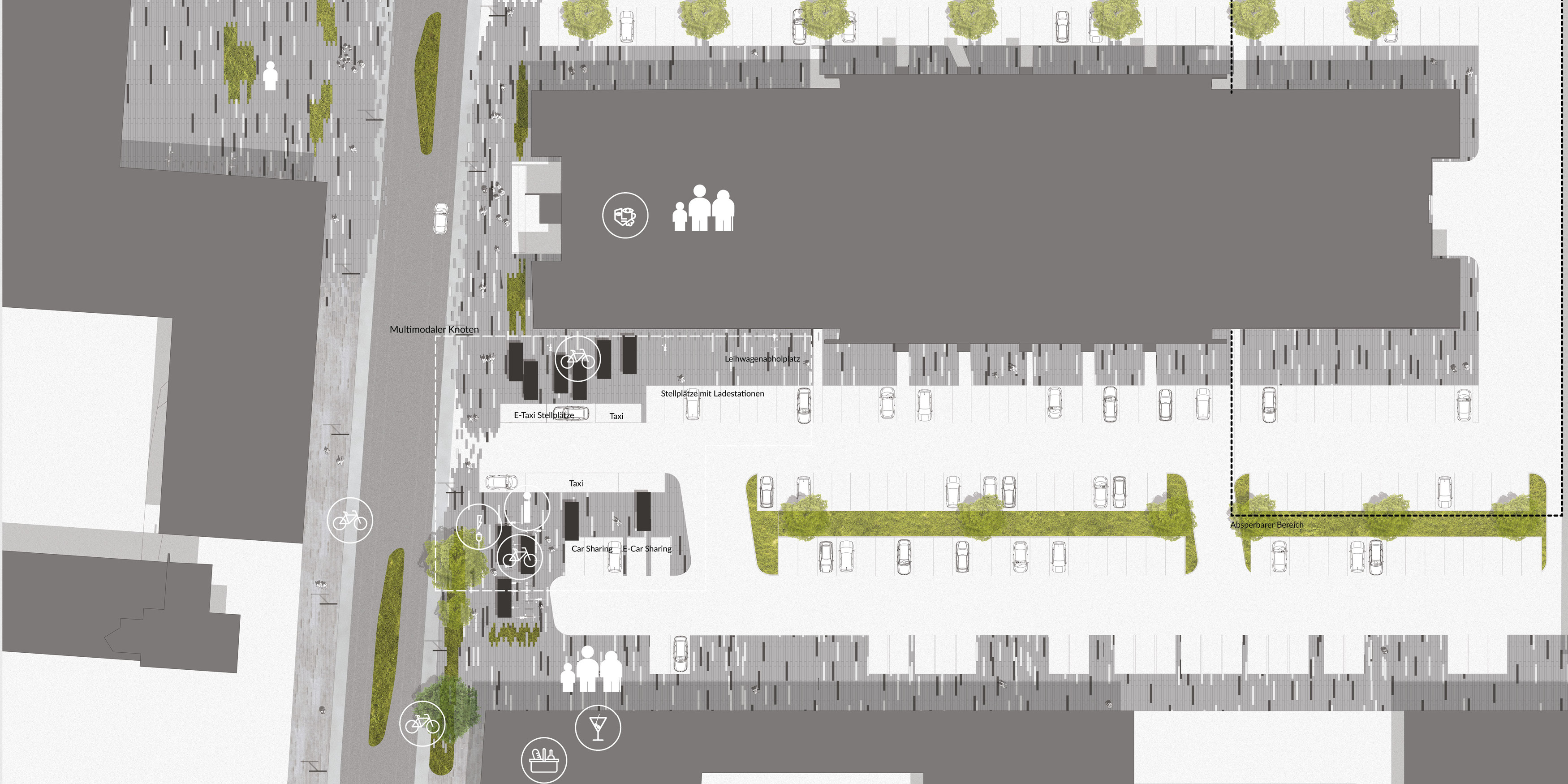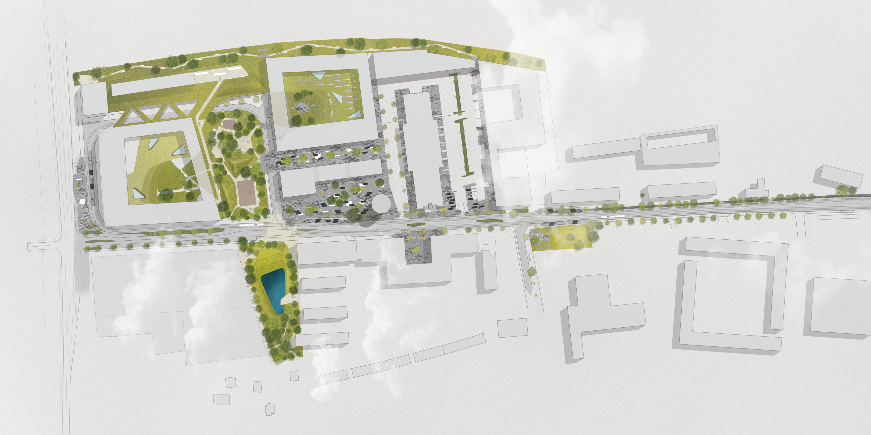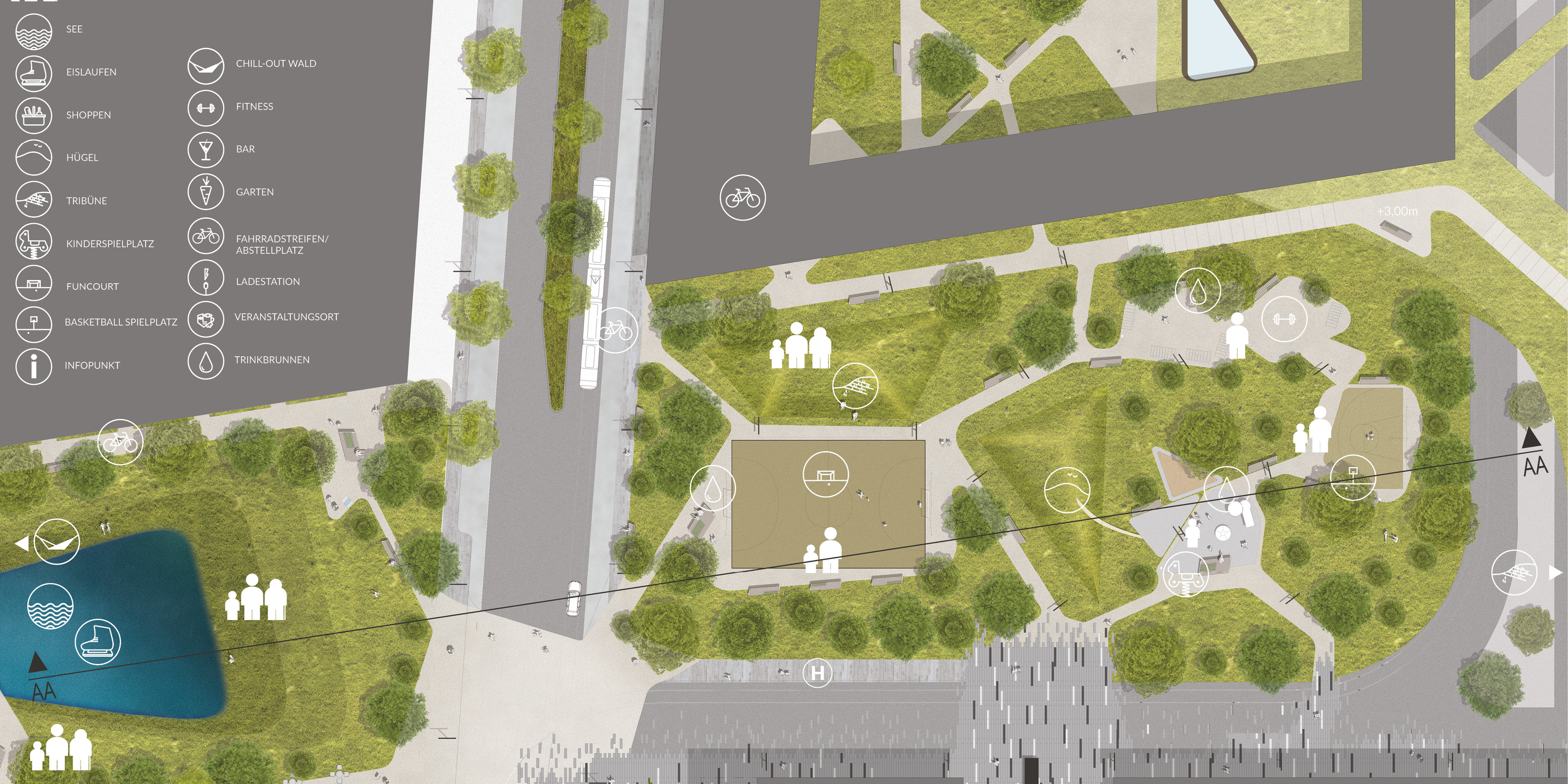 The two main areas, the Quartierpark and the Smart City Center with the main square and the pedestrian mile, form a combination of urban space and open countryside. Although known as urban space, the square also offers lots of green areas and seating for relaxing and recharging, which integrates seamlessly into the whole concept of the space. Together, the individual areas merge into a generous public space that allows for different activities. The result is a beautiful and highly functional public space that can be used all year round by many people for many purposes.