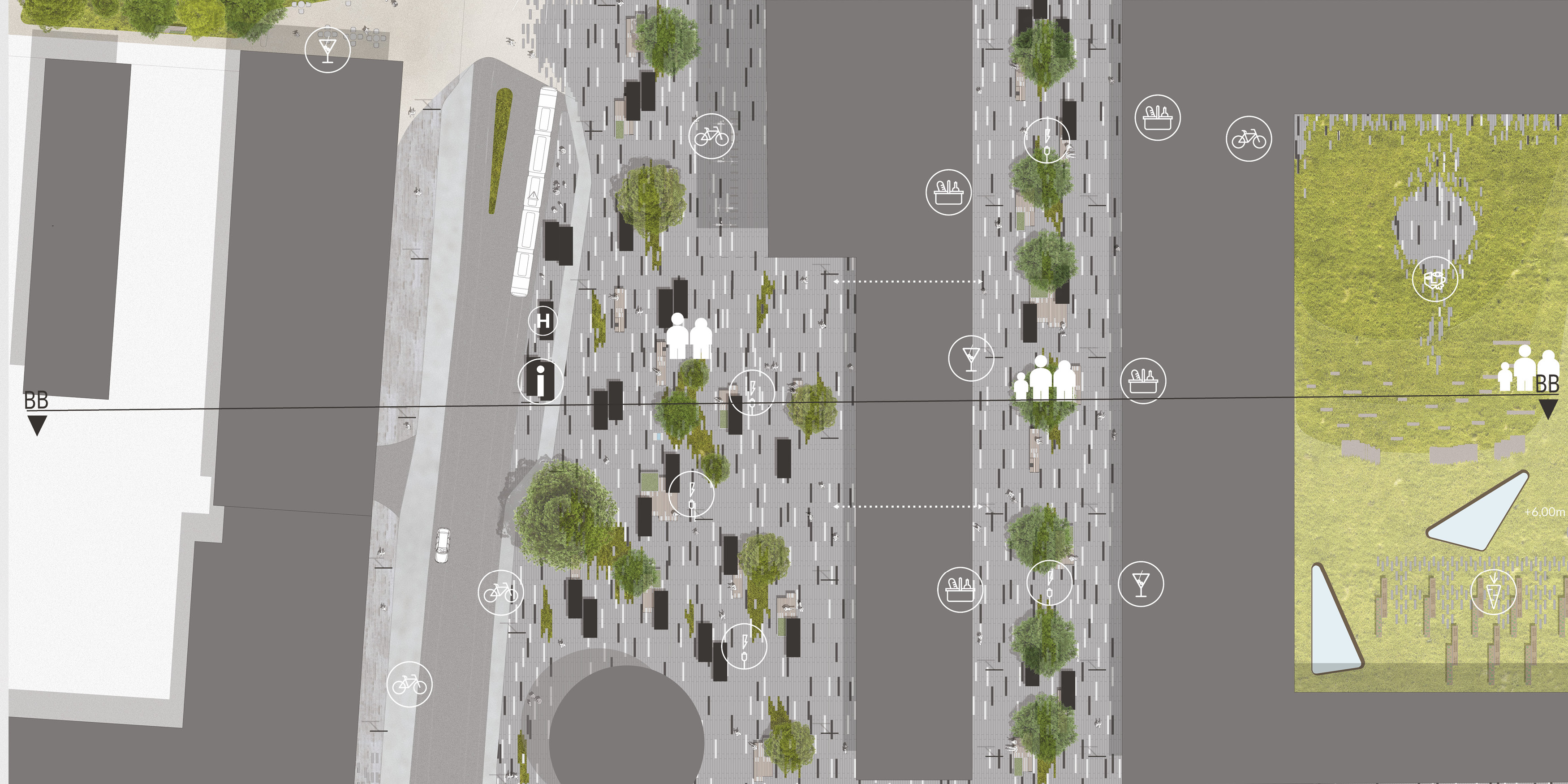 Functional, versatile and edgeless, are the leitmotifs for this design. A public space for people of the 21st century, people who like to spend their time outdoors, who like to walk to their workplace, ride a bike or travel by public transport. The aim is to maximize the potential of the living space in which people move daily. This space is supposed to become a meeting place for people of all generations, with space for various functions and activities.