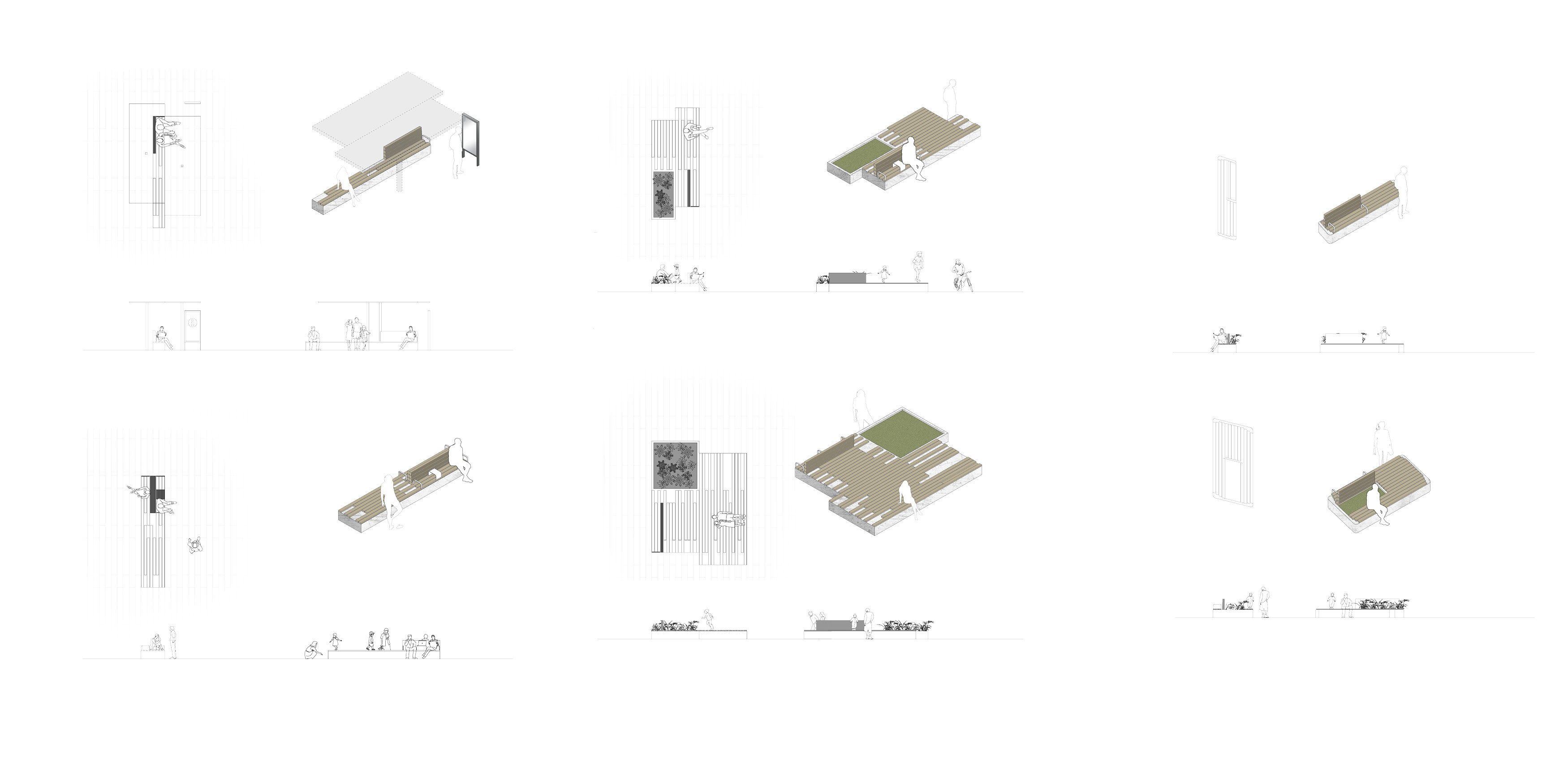 The urban furniture offers seats, loungers and small tables, which serve as work surfaces for people who like to do their work in the fresh air and in the countryside. The furniture also includes rooved shelters that are scattered over the public space. These offer protection from the elements and create a pleasant atmosphere in the evening with indirect lighting and produce electricity with integrated photovoltaic panels on the roof. In the backrest of the furniture are located USB charging points which are fed via the photovoltaic panels. The accumulated rainwater is collected and can be used as domestic water.