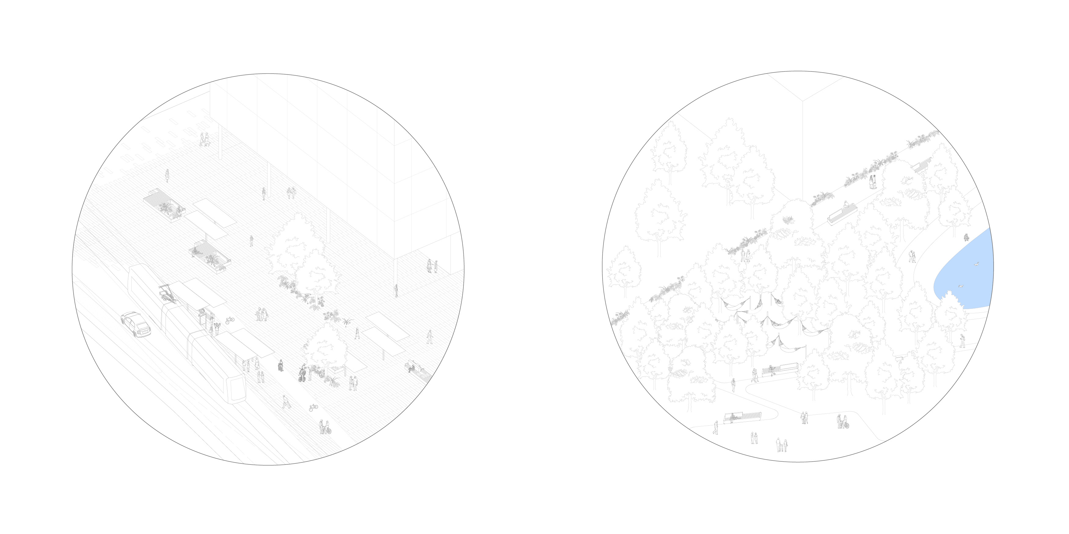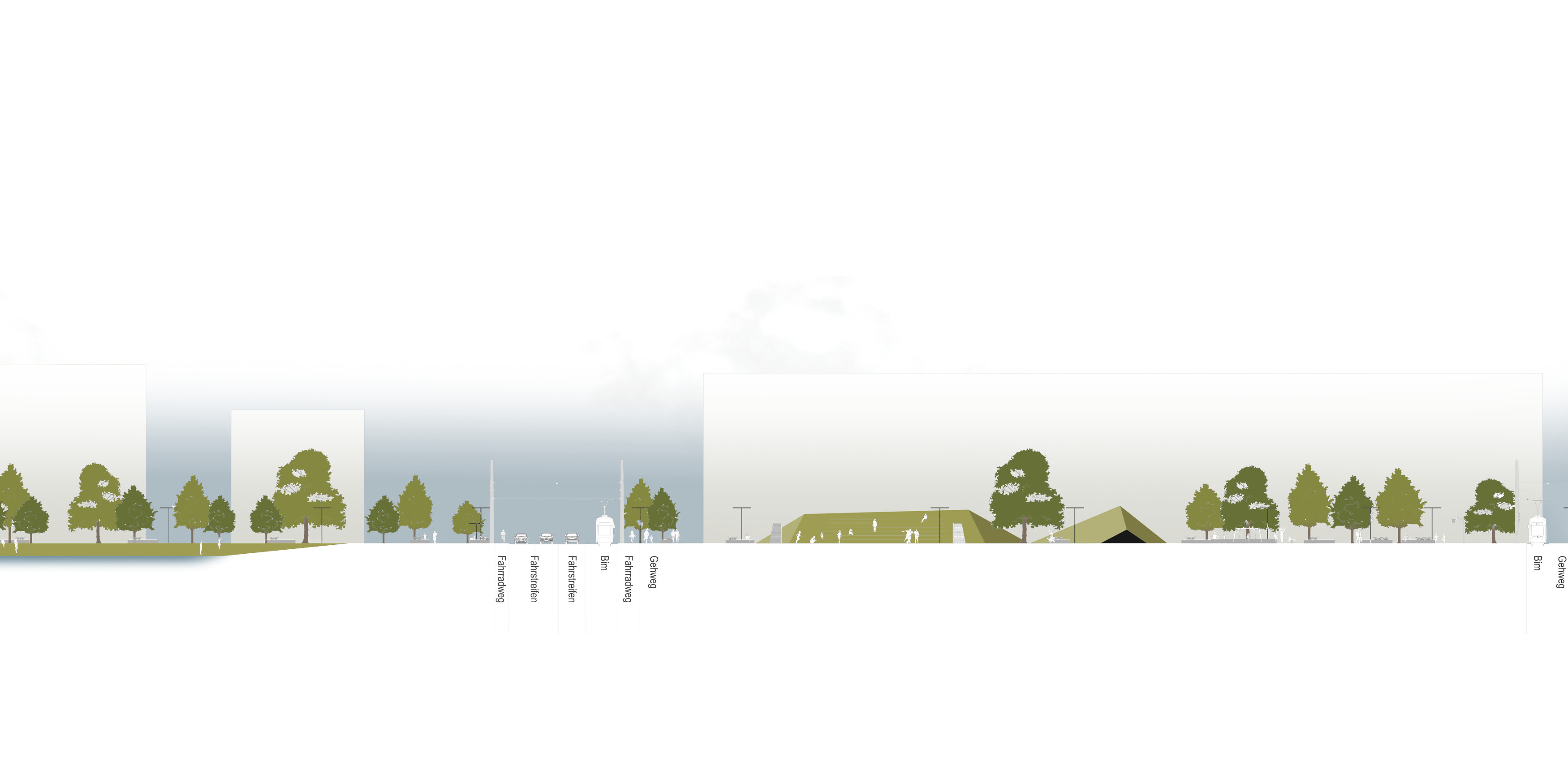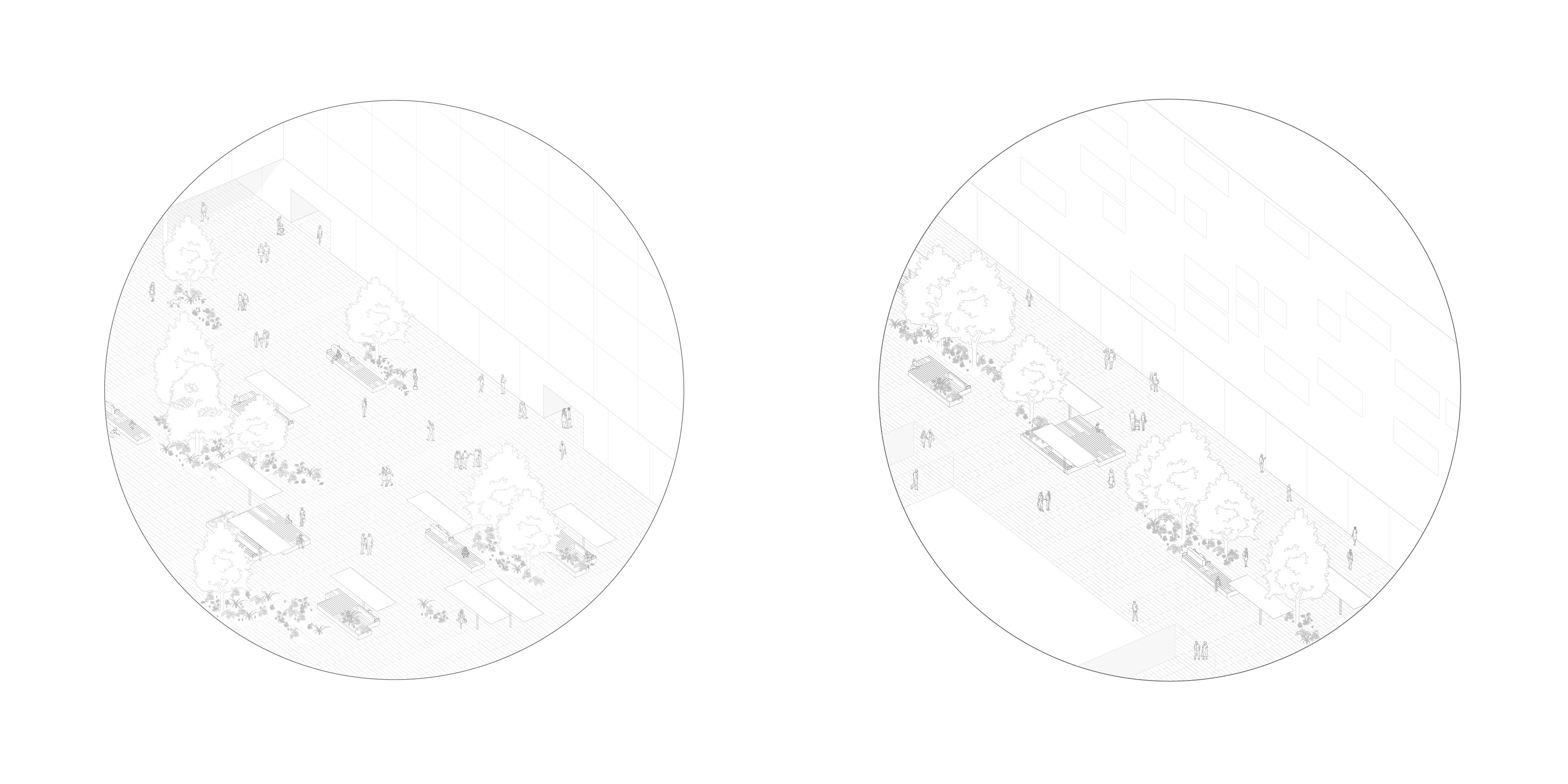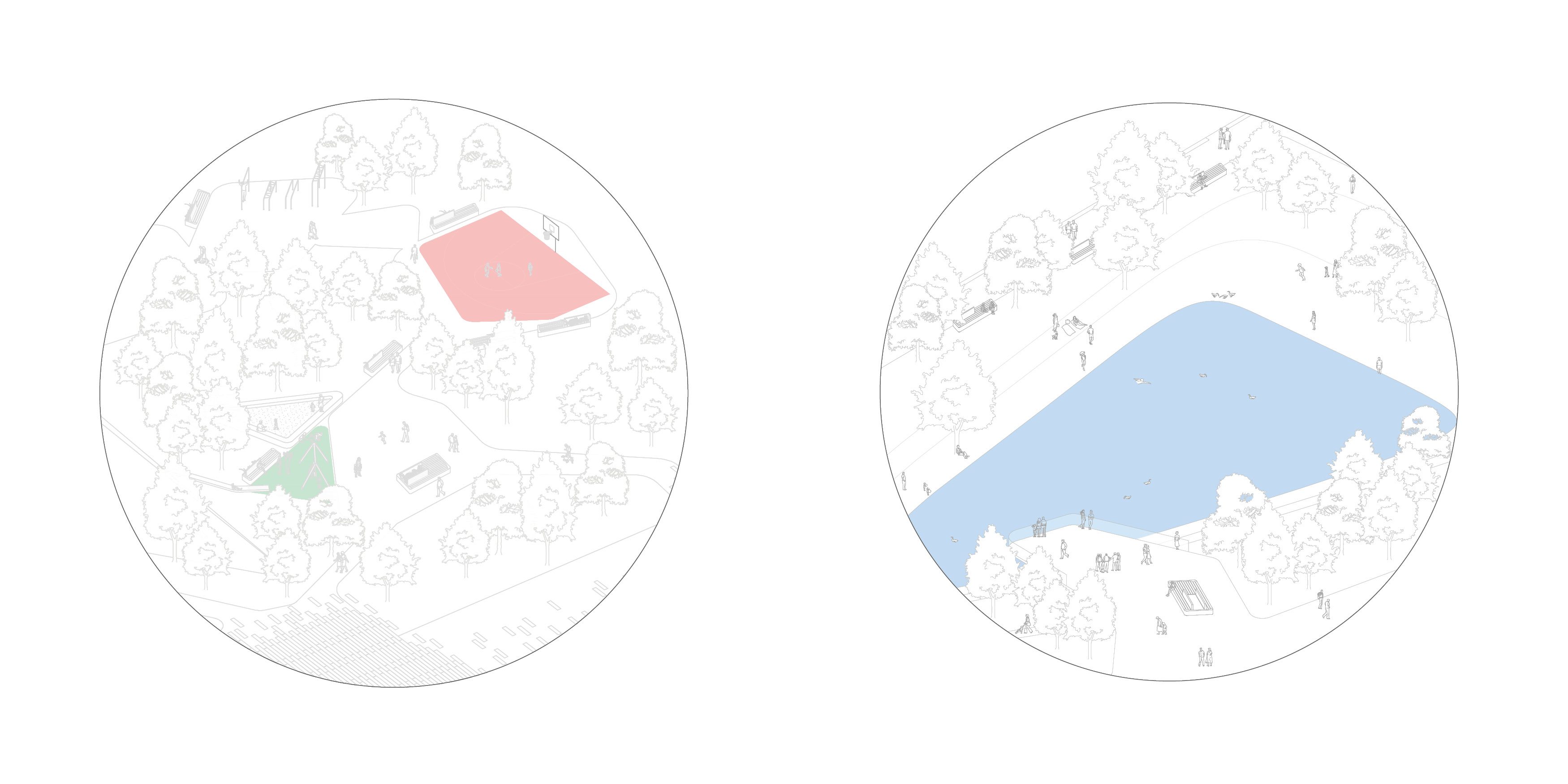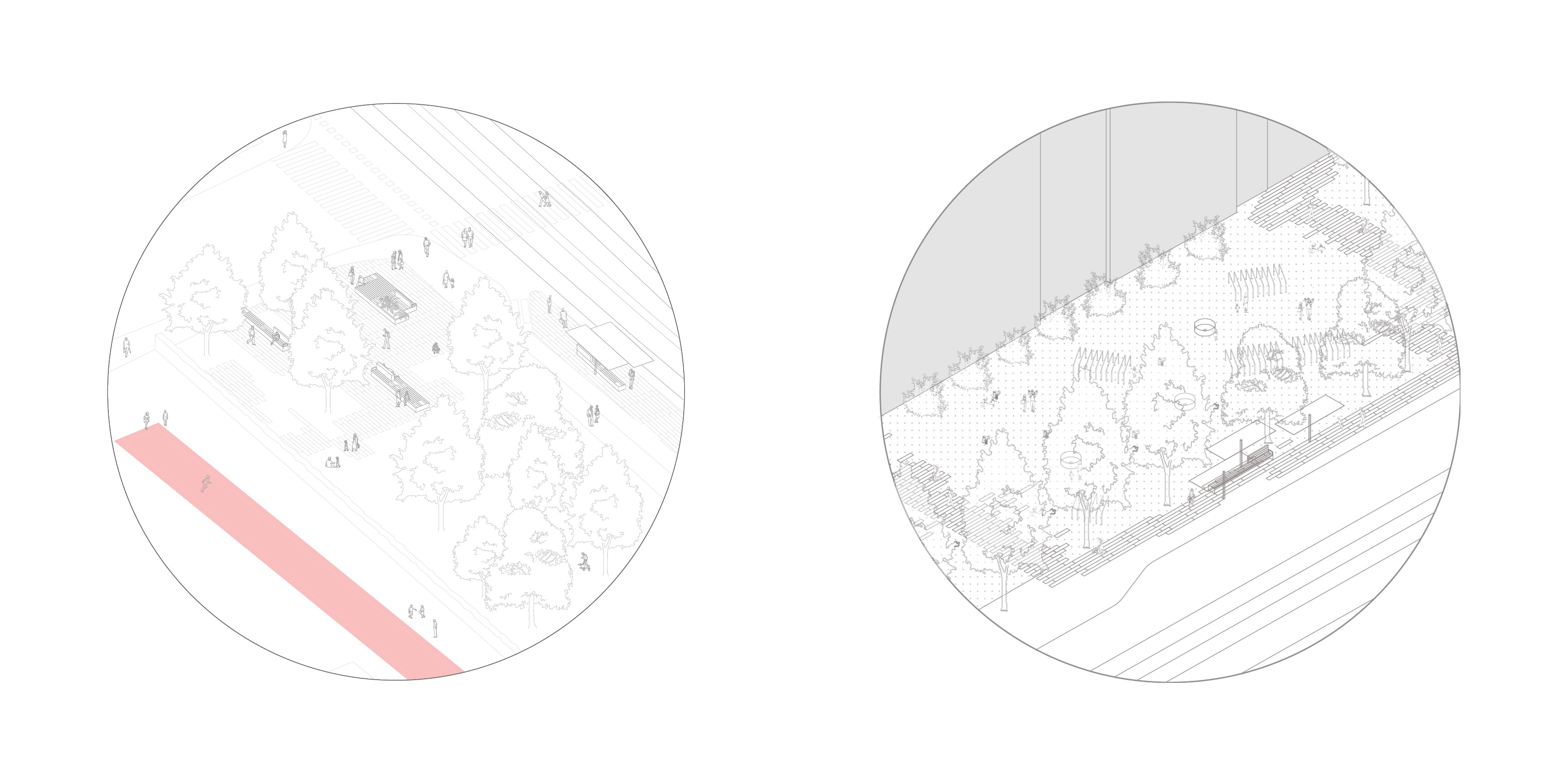 The zone between the north building and middle section is designed as an active zone where people can pursue different sports and leisure activities.