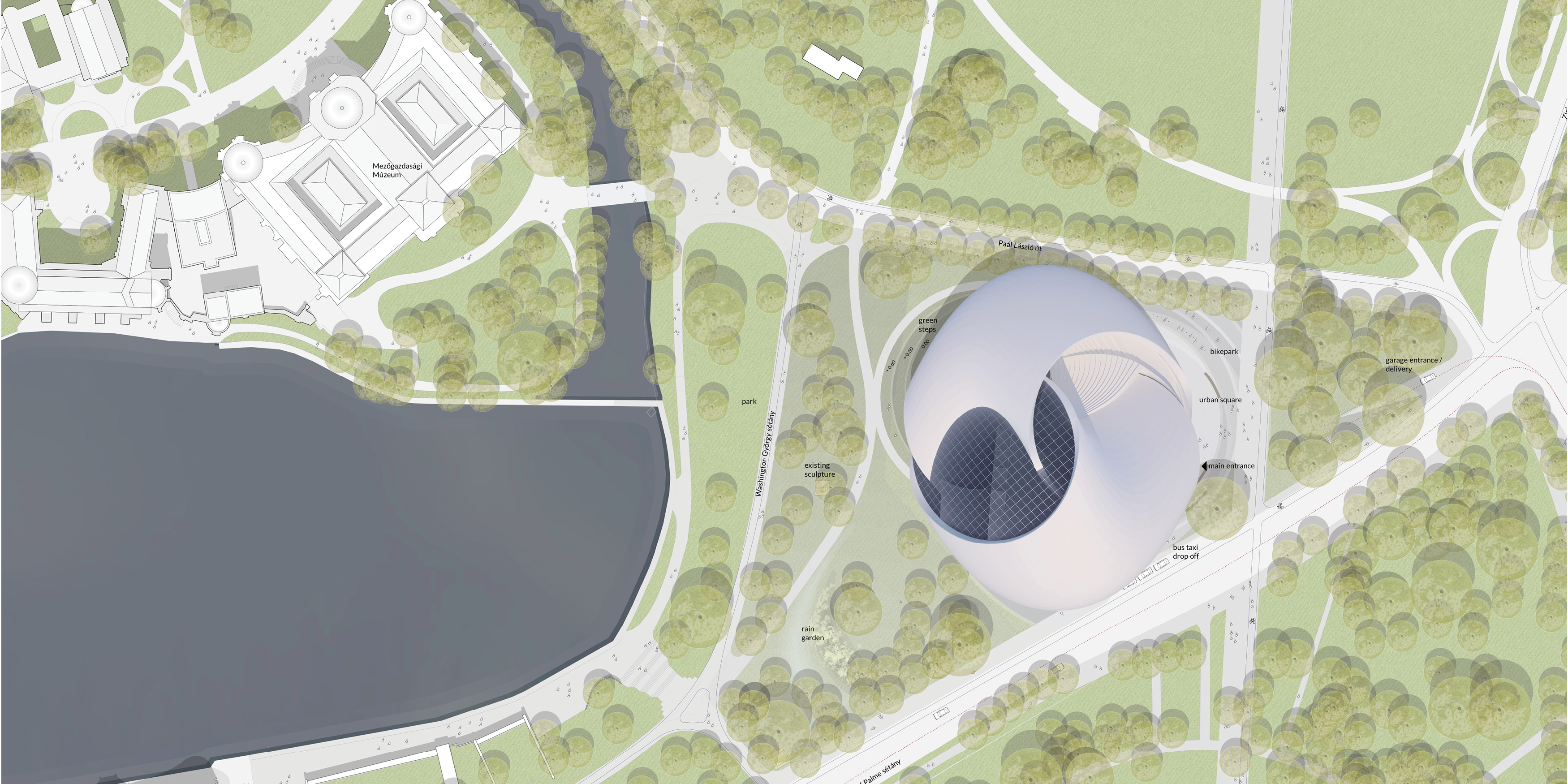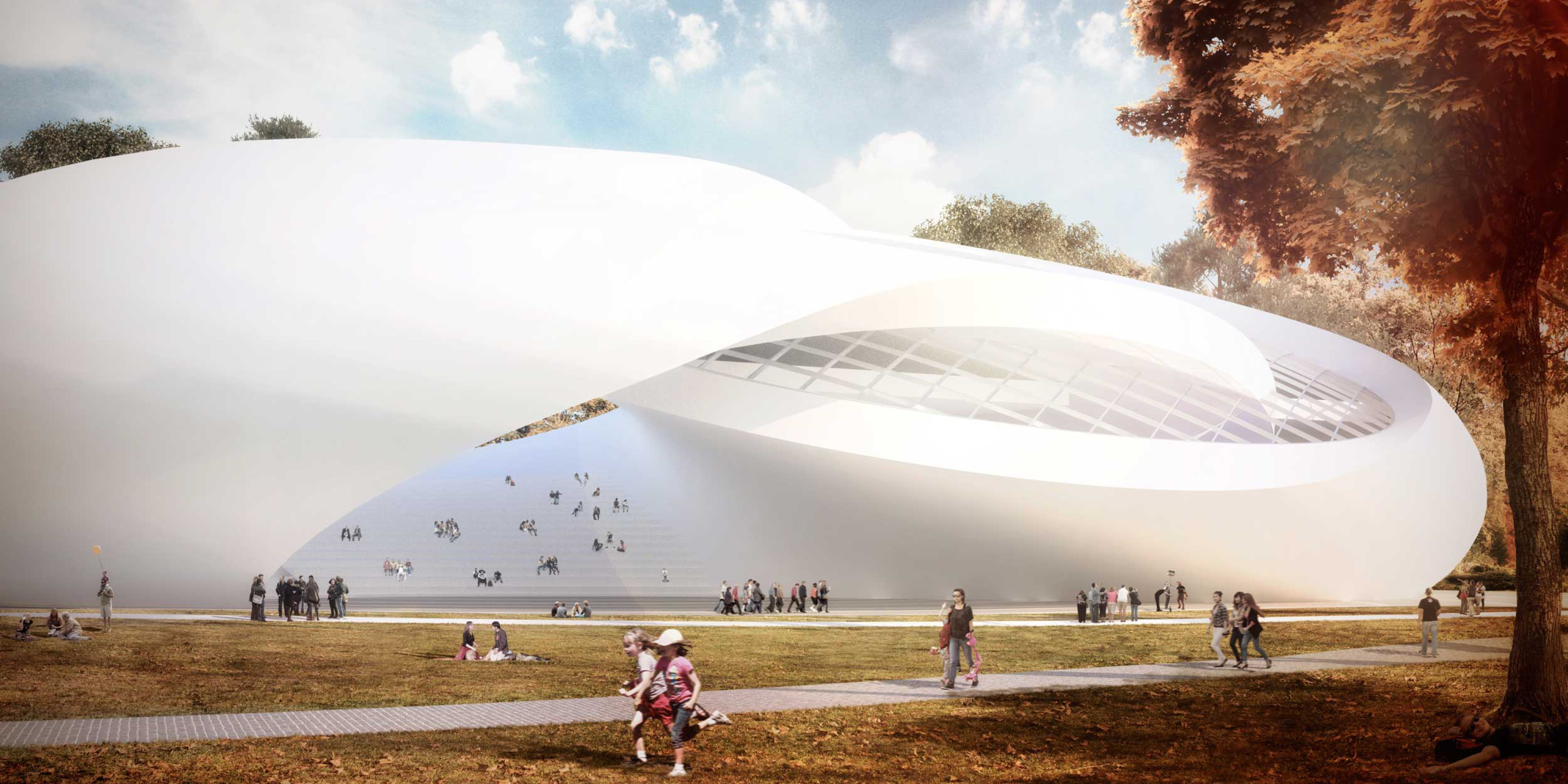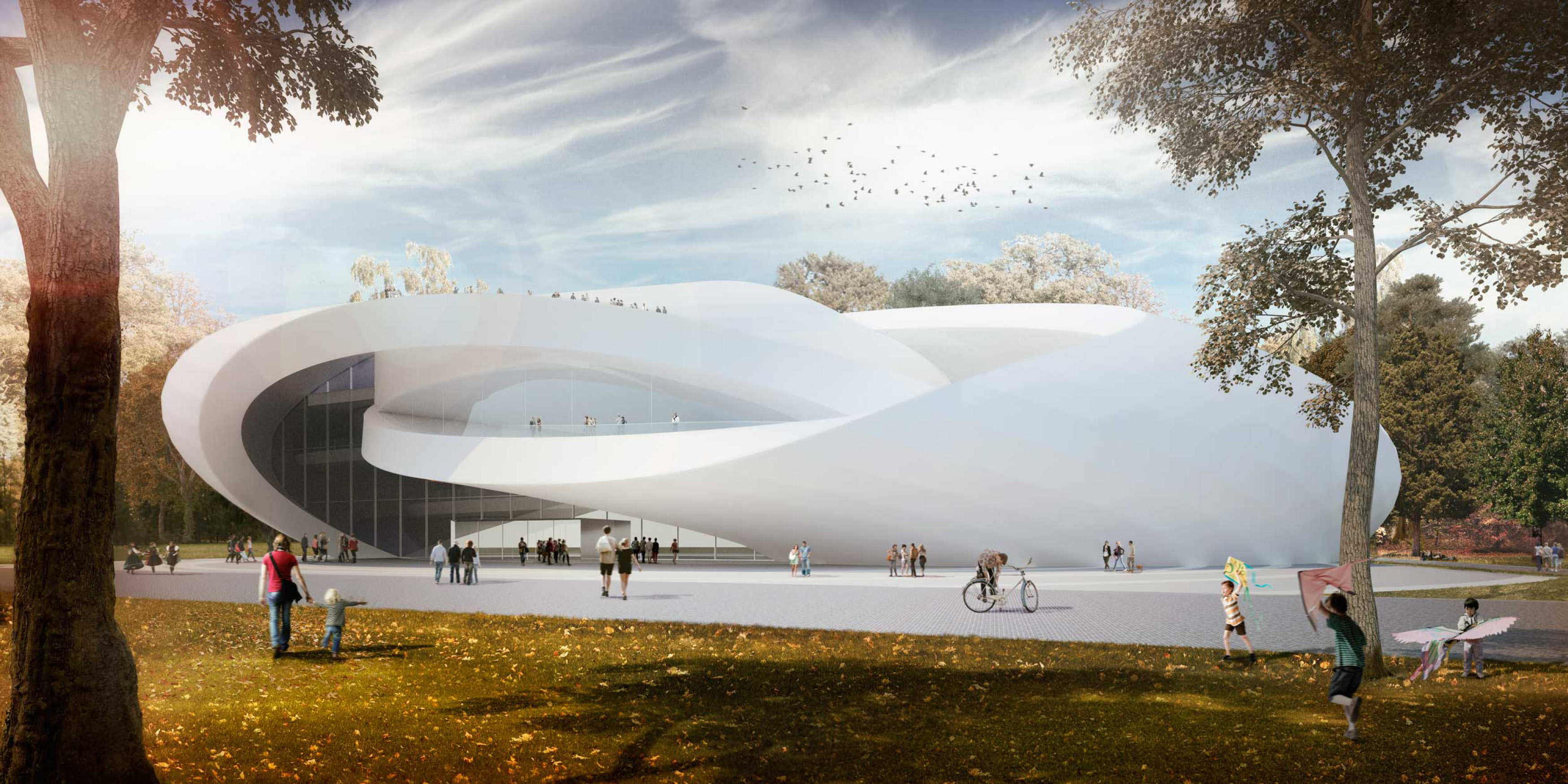Our goal was to create something that has a strong identity and that could be seen as a sculpture standing in the middle of the park. We decided to make a building that simultaneously serves as a symbol, easily recognizable and unforgettable. A building that offers a lot of public space as well as providing an exciting interior. The organic form seems rather complex at a first glance, but through its complexity it offers various spatial experiences and gives the visitors the opportunity to discover the building from different angles and interact with music turned into “stone”.