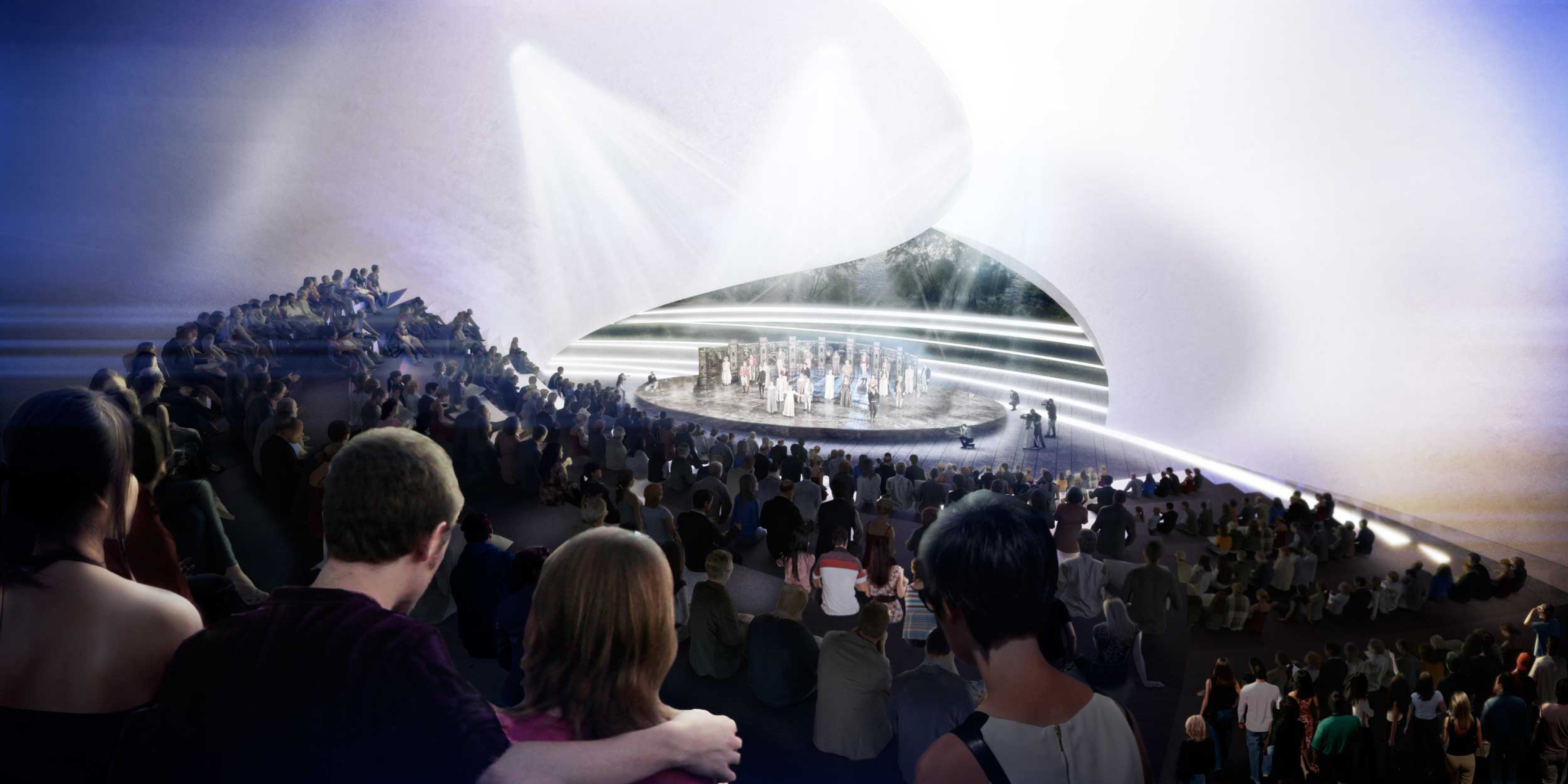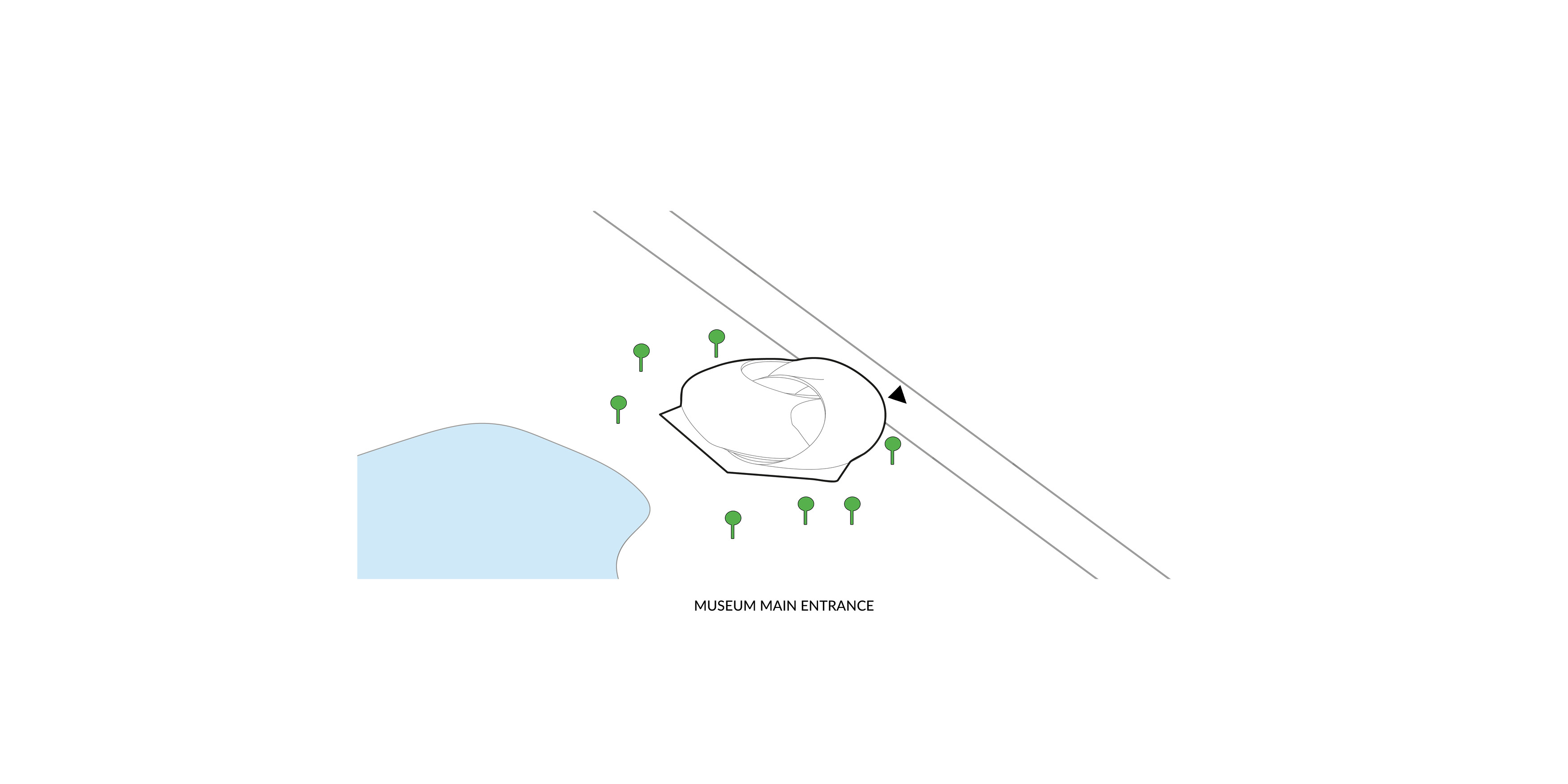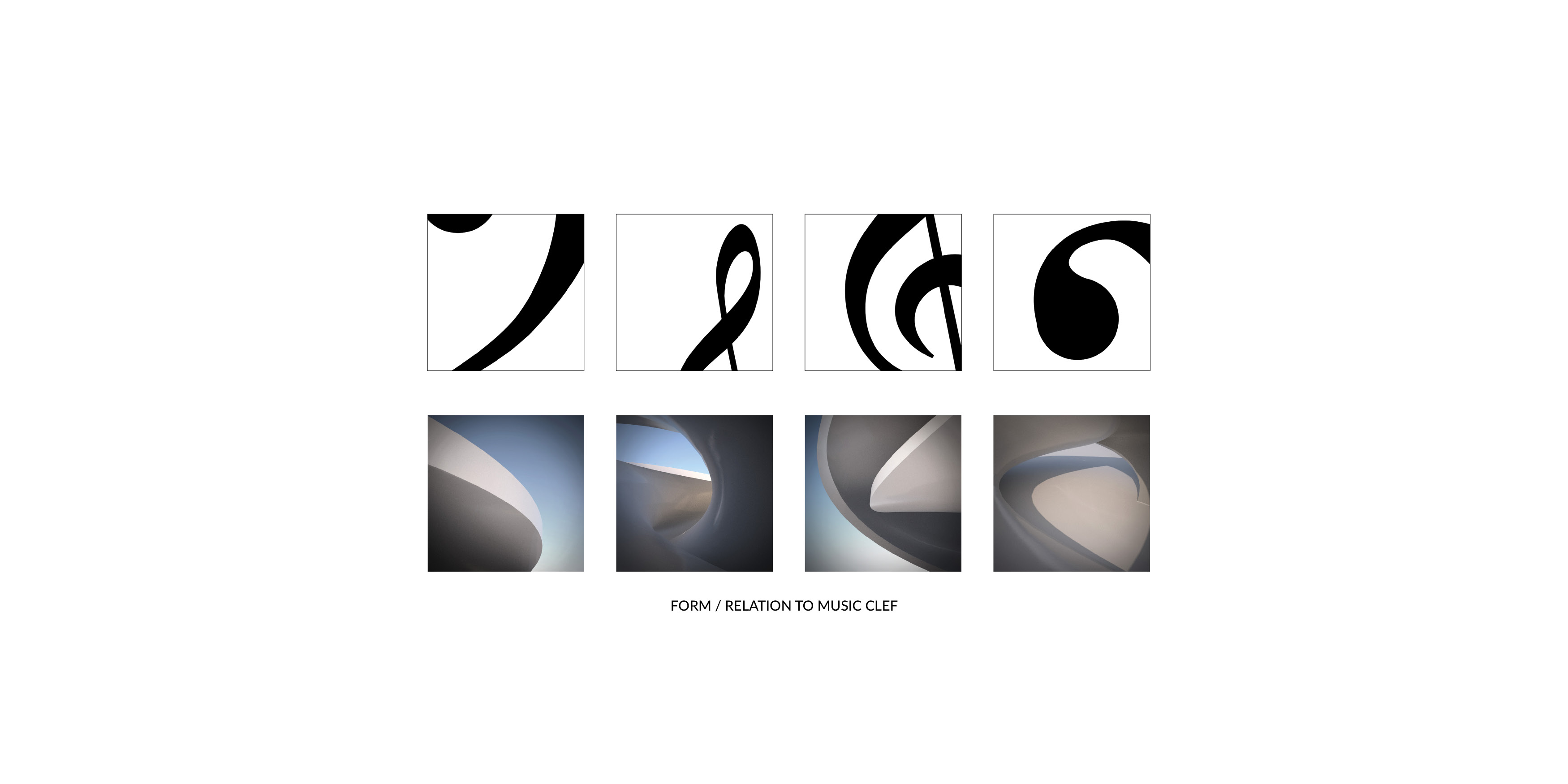 We transformed music into architecture by looking at the typical annotation elements in music like the G clef or the F clef, which are also examples of visual representation of music. We started to develop a form inspired by these elements and details we could find in them. By creating two intertwined identical forms we created the closed part for the museum and the open public part for the open-air theatre. Instead of changing the existing landscape we wanted to preserve it as much as possible and integrate it into our concept. The two forms create a dichotomy of the void and fill space. The form also improves the acoustics and provides noise protection for the open-air theatre.