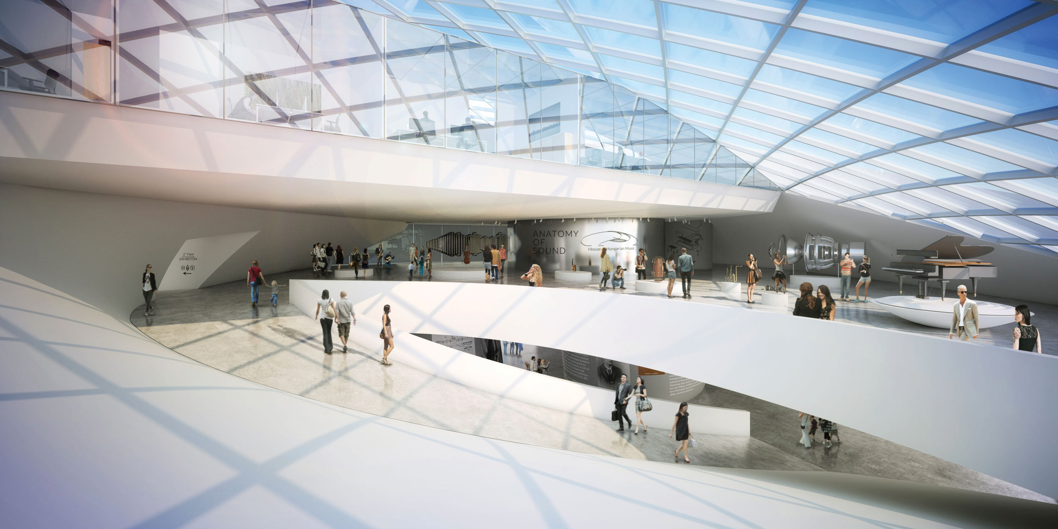 The open-air theatre provides a great concert space, but also serves as a place to rest and enjoy the view of the lake and the park. On the other side, the interior of the museum plays with the musical curves of the outer shell to create an interesting space for the visitors.