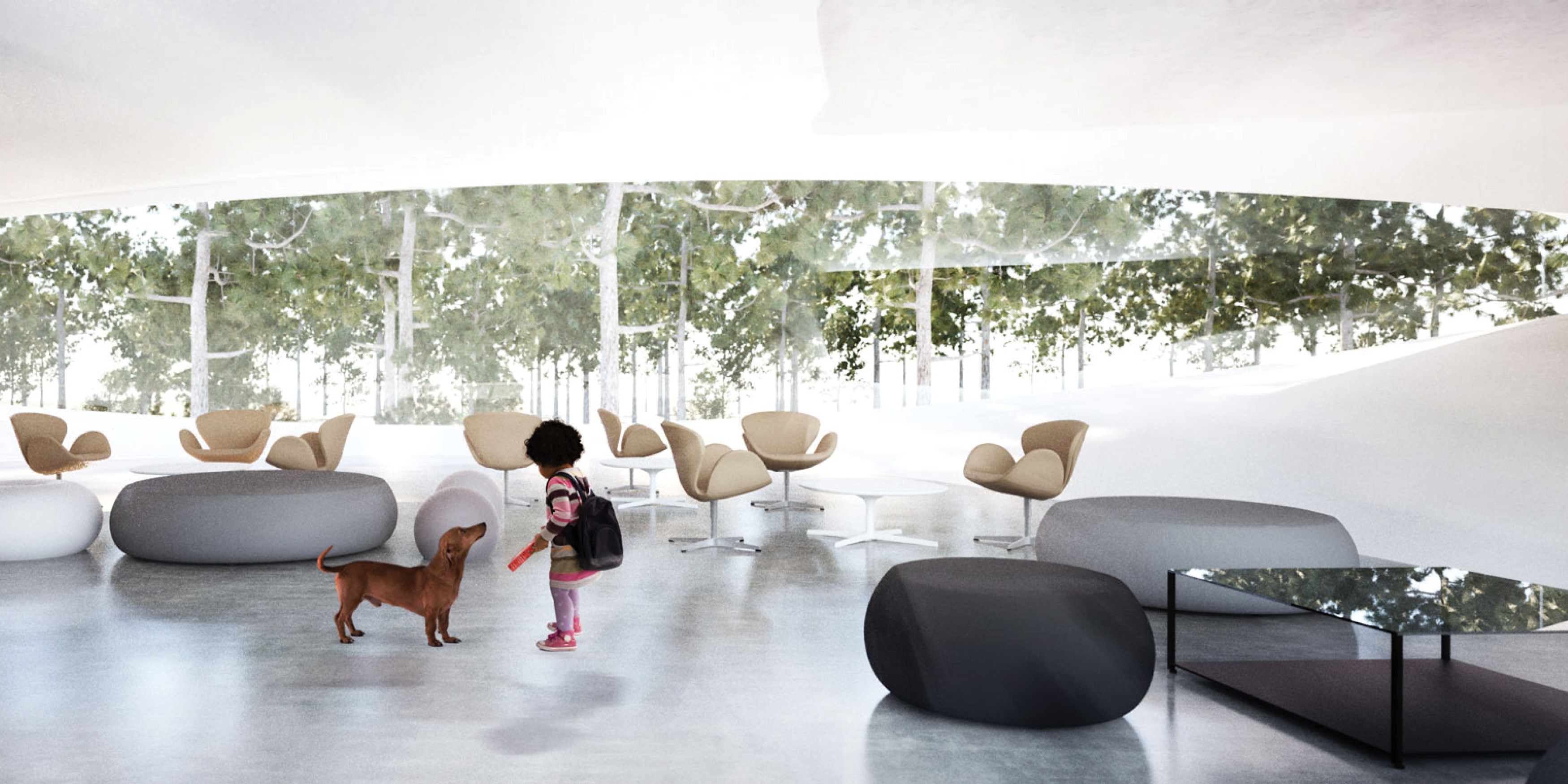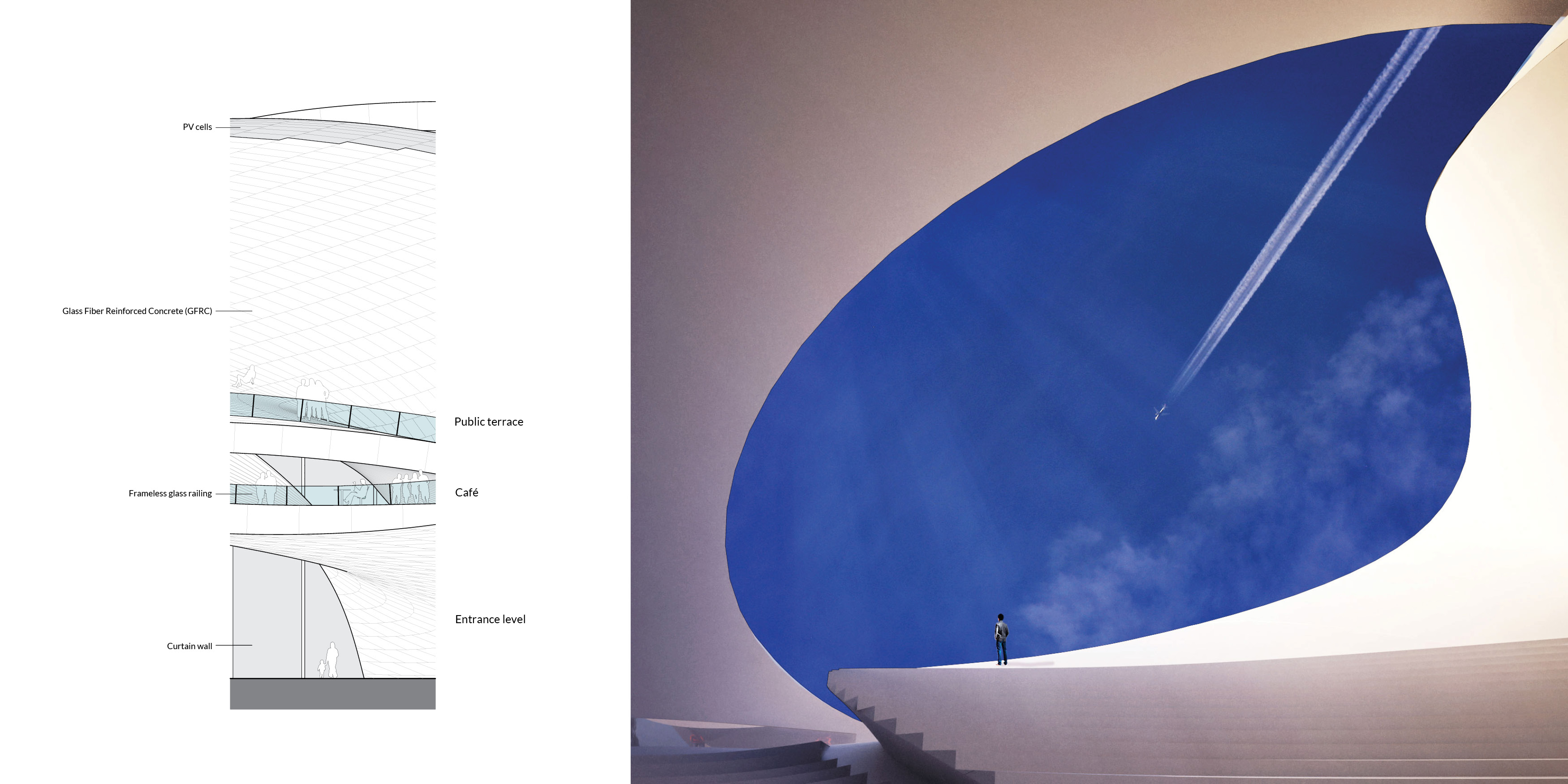 The two parts, beside the open and closed part, also create an object which doesn´t have a front or back, it shows the same dynamic and beauty from each of its sides and creates a balance with the beautiful nature of the park because we felt it really important for this building to be beautiful from every angle.