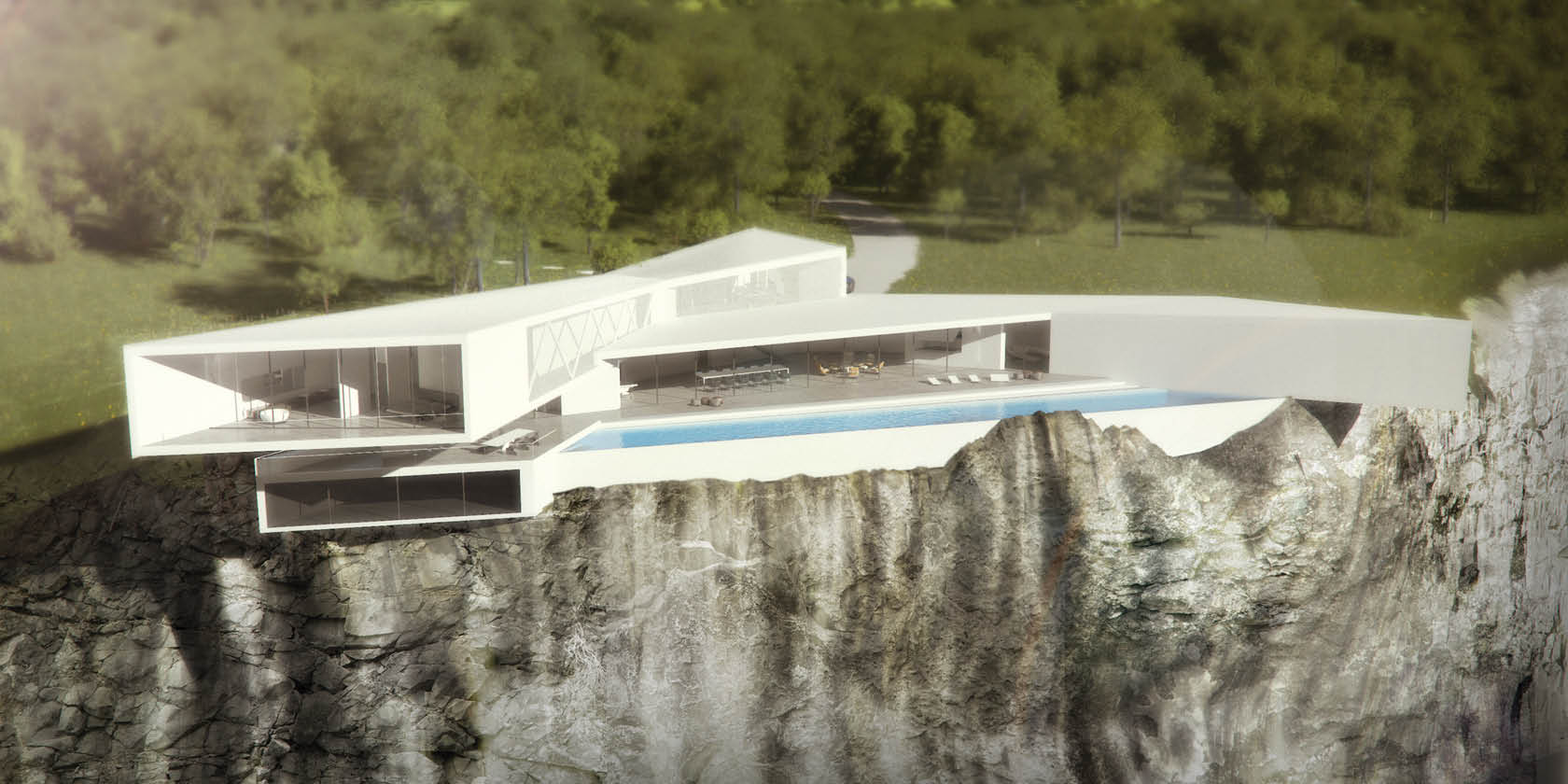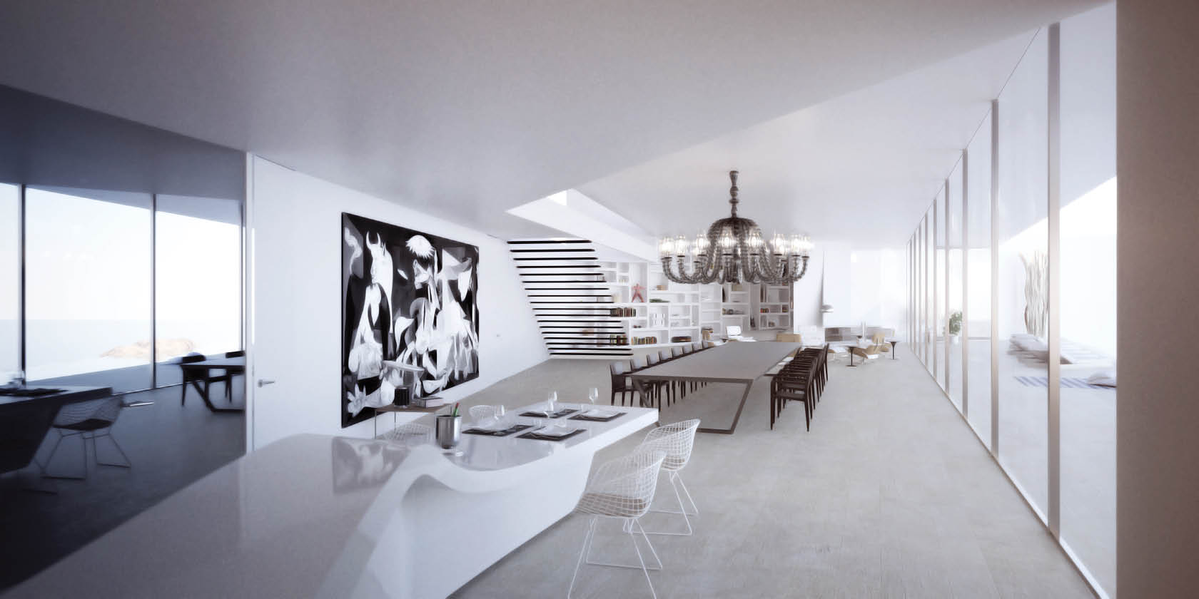 At the top floor there are sleeping accommodations for the whole family. The master bedroom with the bathroom gets a breath-taking view on the entire bay. Another important part of the building is the private office. Our client must be able to work at every time of day and night. So we had to design a friendly working environment. That’s the reason why this room became the only one with a 360° view, so the user is able to see the complete surrounding without losing the connection to the sea and of course his family. Beneath the luxurious interior and the large-scale rooms this mansion offers even more. At the lower floor there is a private movie theatre and a high-tech wine cellar together with a party and dining room for up to 22 guests, supported from a catering kitchen. Another very critical part was to provide enough space for their sport activities. The most impressive part of our fitness concept is the giant pool, which was defined by the landscape. We were able to use the natural stone structure of the cliff and combine it with our modern design. There is also fitness and a sauna area placed at the lower level, so they can do their workout while looking at the ocean.