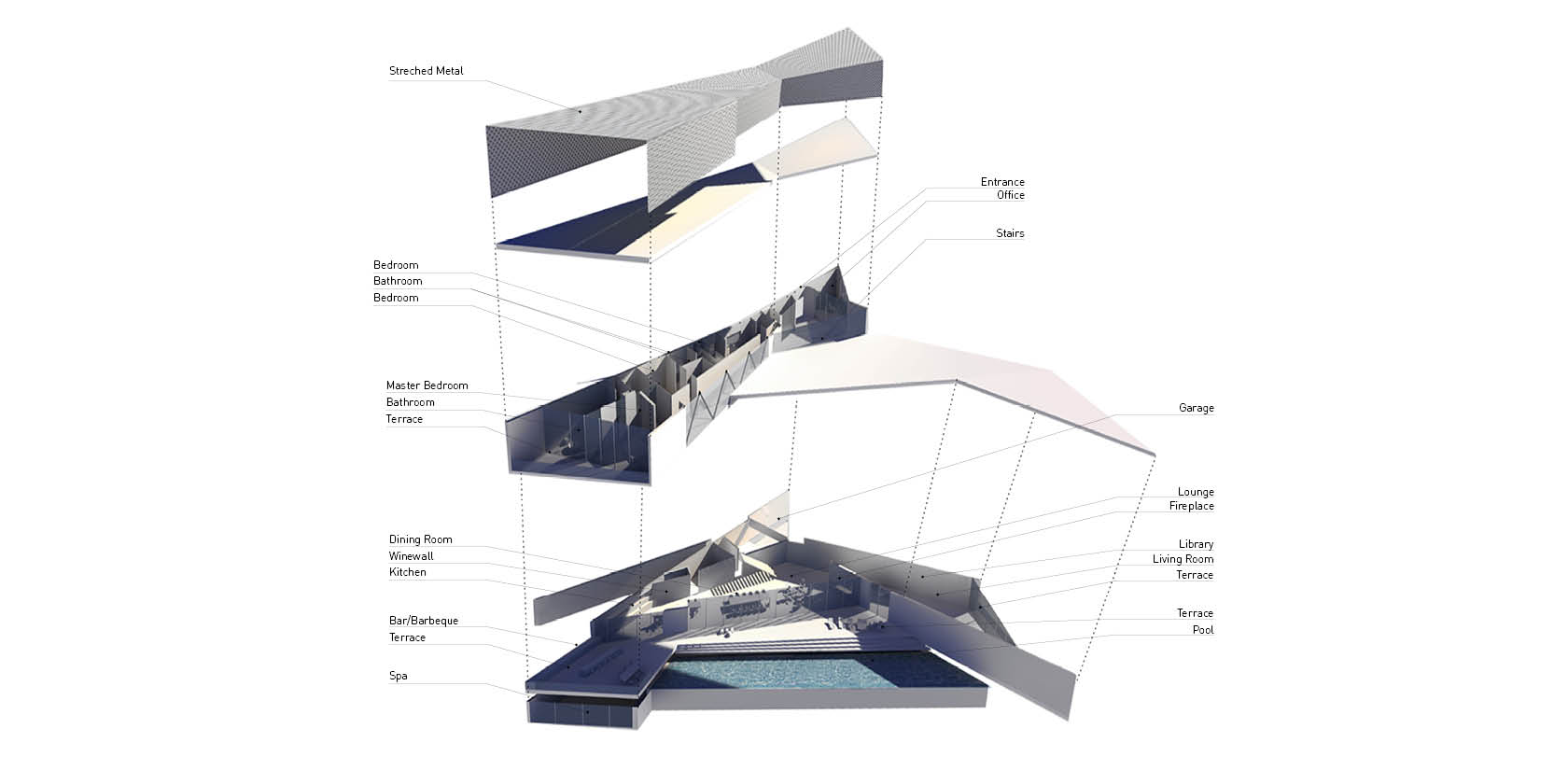 The main idea was to create a Building which provides the highest amount of privacy and comfort so the people can forget all their worries, on the other side it was meant to be a representative mansion. So they would be able to invite important costumers or to arrange a cultural event. The shape of the building resembles a heart protected by two wings. The two wings create a private area which is completely open to the seaside and offers a very impressive panorama of the Adriatic Sea. The main terrace is reachable from every room at the ground floor and serves as the meeting point of this building. The huge infinity swimming pool creates the illusion of standing right next to the sea. The directions of the shapes are not just creating the surrounding for the exterior, they are also designed to guide the people through the building and offer them special viewpoints. The structure creates the frame for each of those panoramas.